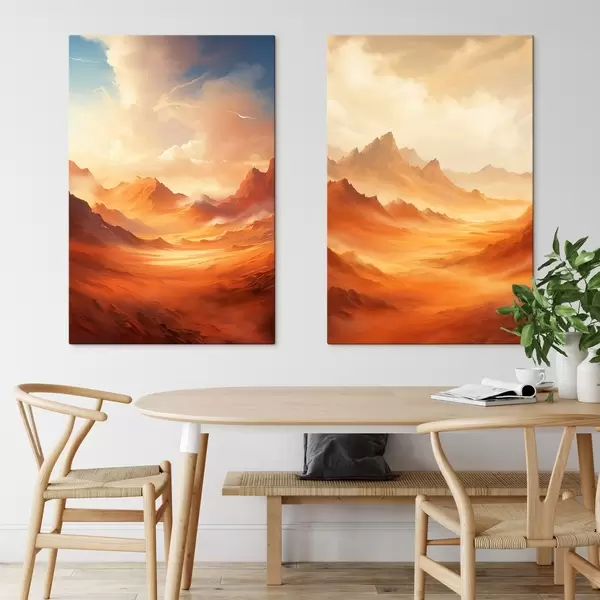 Gemälde Eine weite, orangefarbene Wüstenlandschaft mit hoch aufragenden, felsigen Bergen unter einem dunstigen, sonnenbeschienenen Himmel mit dünnen Wolken. Art. m01122