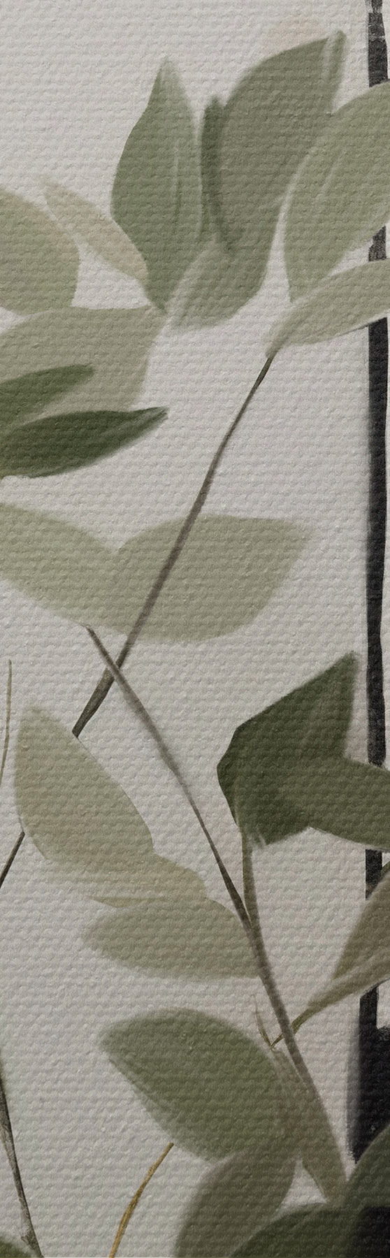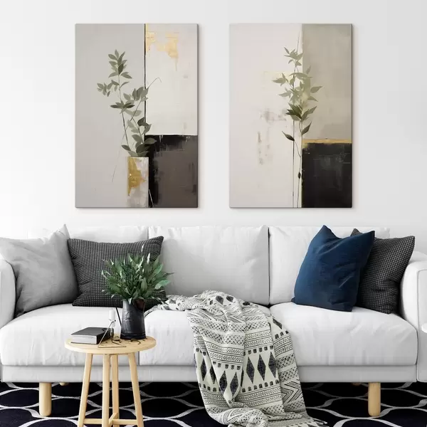 Gemälde Ein minimalistisches, strukturiertes Gemälde einer Vase mit grünen Blättern vor einem Hintergrund aus abstrakten geometrischen Formen. Art. m01126
