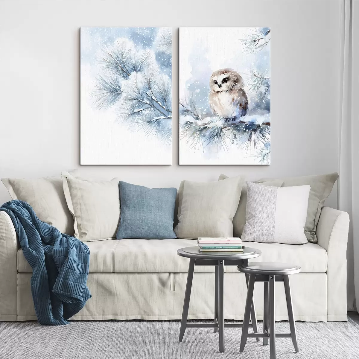 Gemälde Niedliche Eule auf einem schneebedeckten Tannenzweig im Aquarellstil Art. m01168