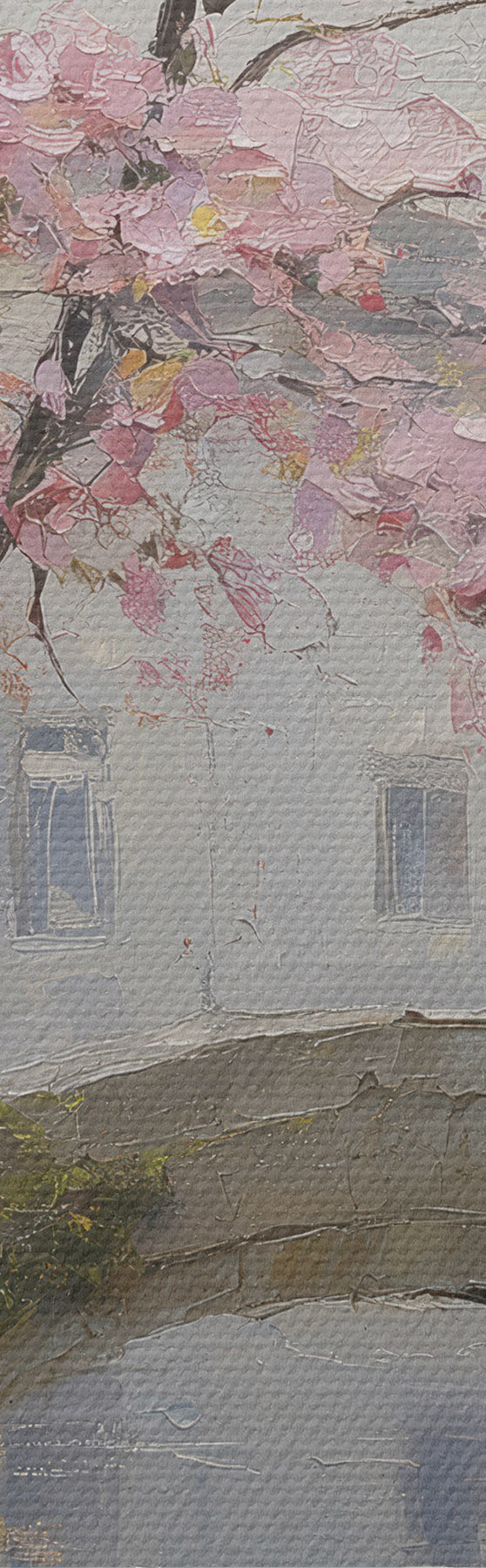 Gemälde Romantisches Stadtbild mit einem blühenden Baum im Stil eines Ölgemäldes Art. m01173
