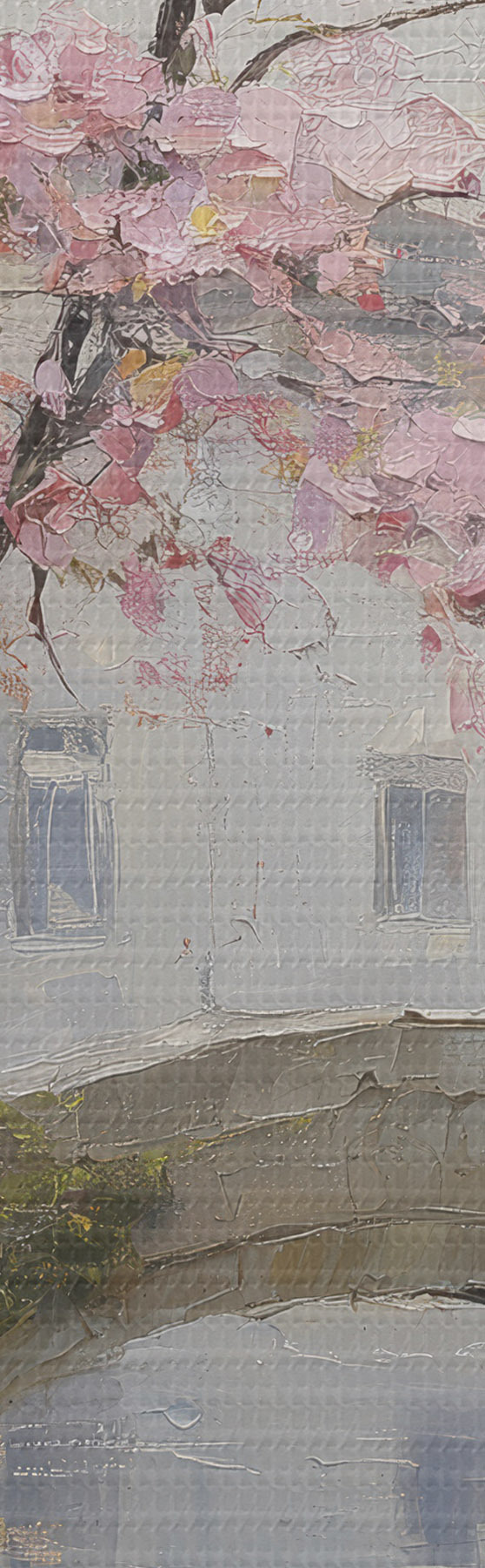 Fototapete Romantisches Stadtbild mit einem blühenden Baum im Stil eines Ölgemäldes m01173