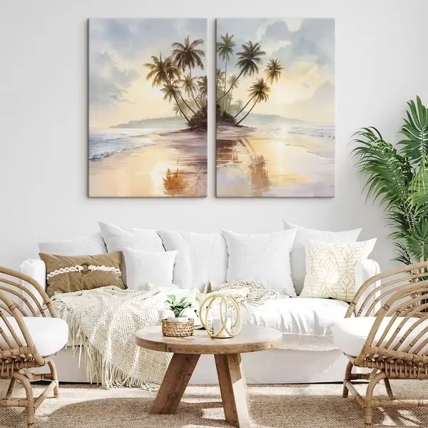 Fototapete Sonnenuntergang am Strand einer Insel im Aquarellstil m01177