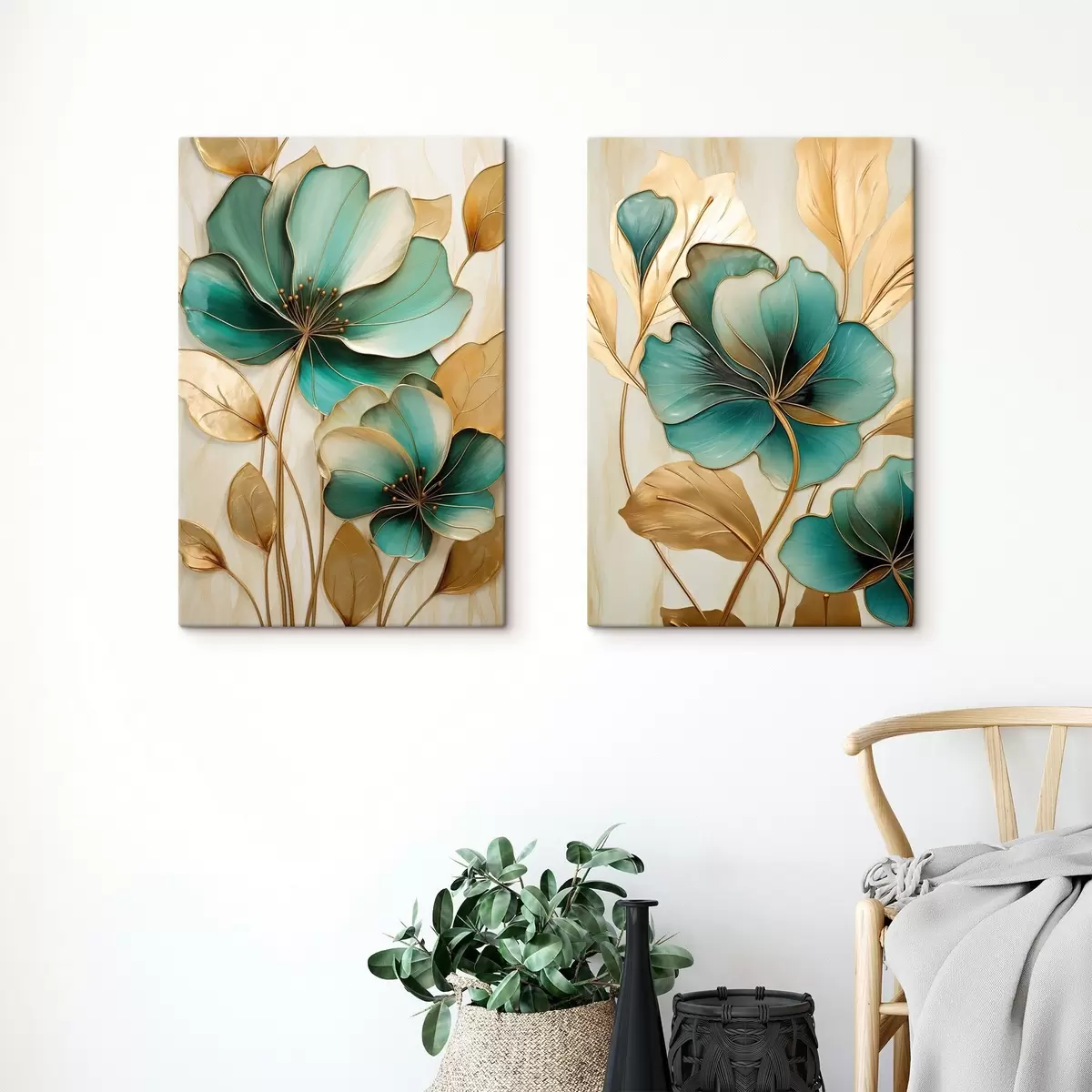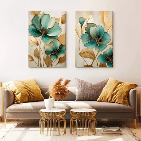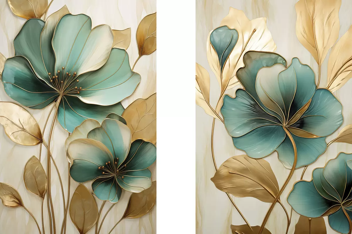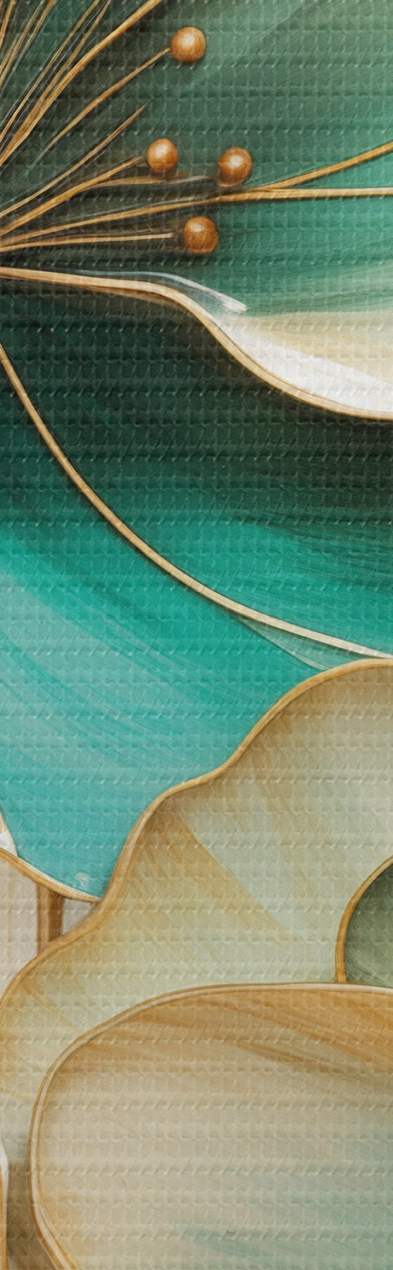 Gemälde Große blaugrüne und gelbe Blumen mit Konturen, umgeben von gelben Blättern vor abstraktem Hintergrund Art. m01235
