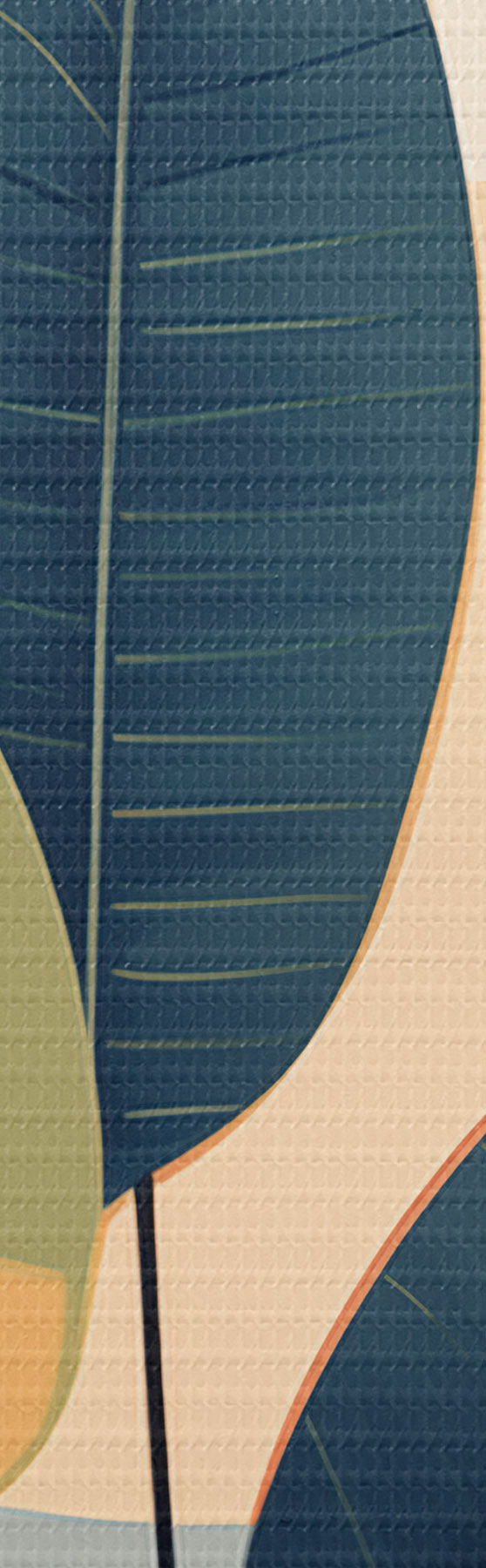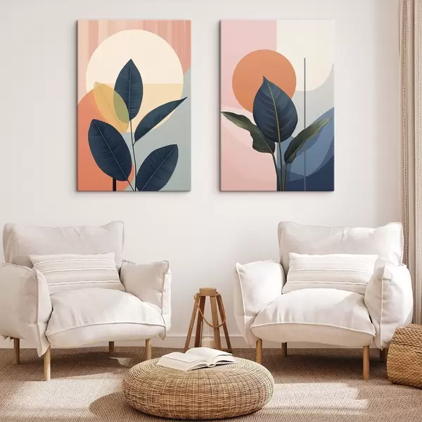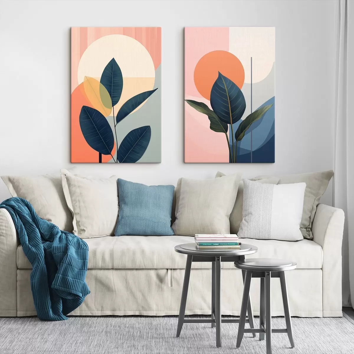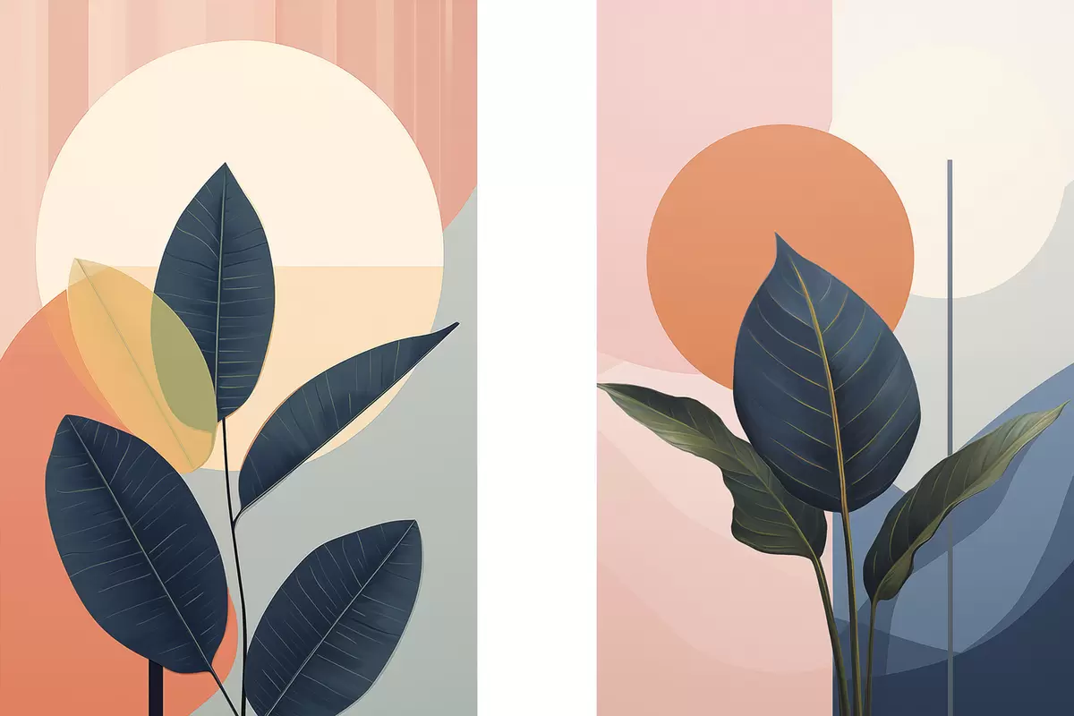 Fototapete Dunkle Blätter vor einem Hintergrund aus abstrakten Formen in Pfirsich und Grau mit einem großen, hellgelben Kreis m01238