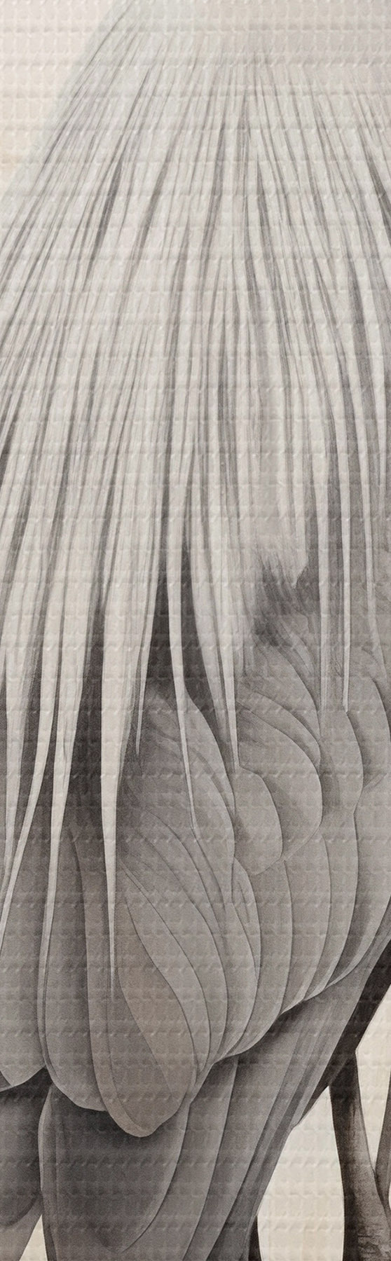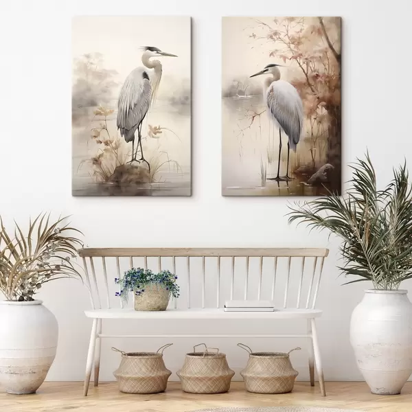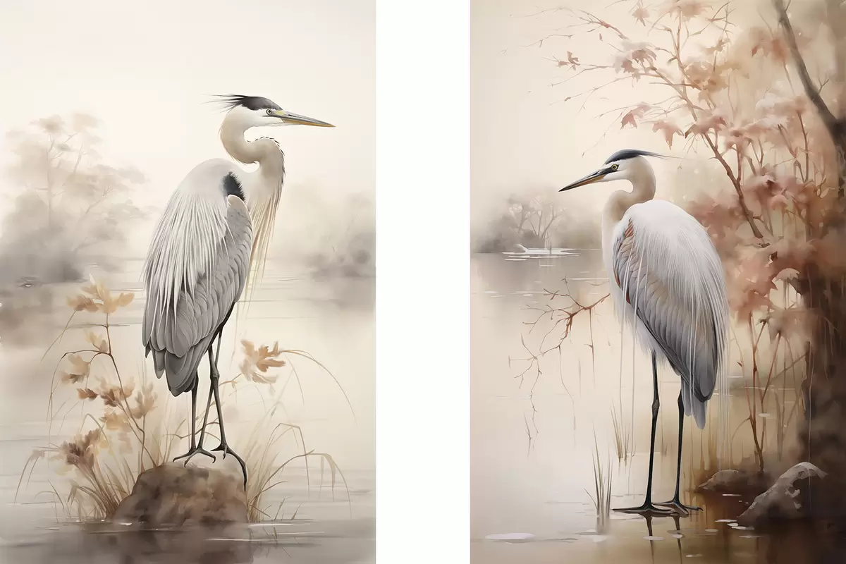 Gemälde Ein Reiher steht auf einem Felsen in einem See, im Hintergrund hohe Gräser und Bäume. Art. m01239