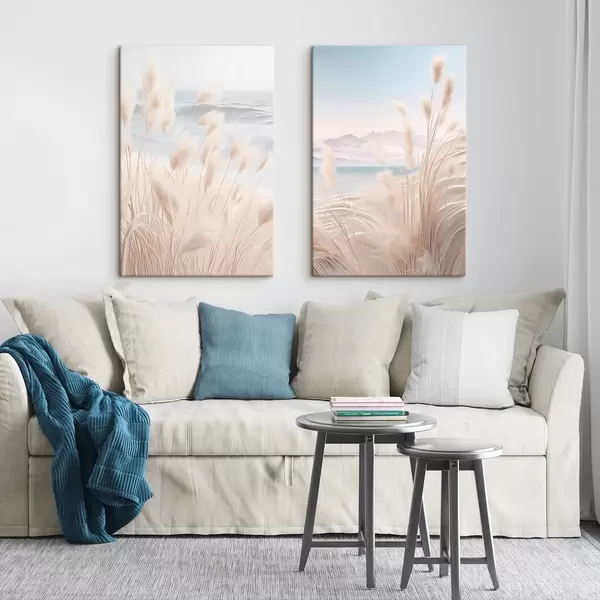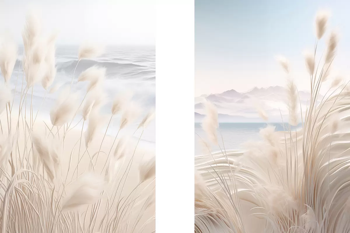 Gemälde Hohes, federartiges Pampasgras in sanften Beigetönen im Vordergrund, mit einem Sandstrand im Hintergrund Art. m01242