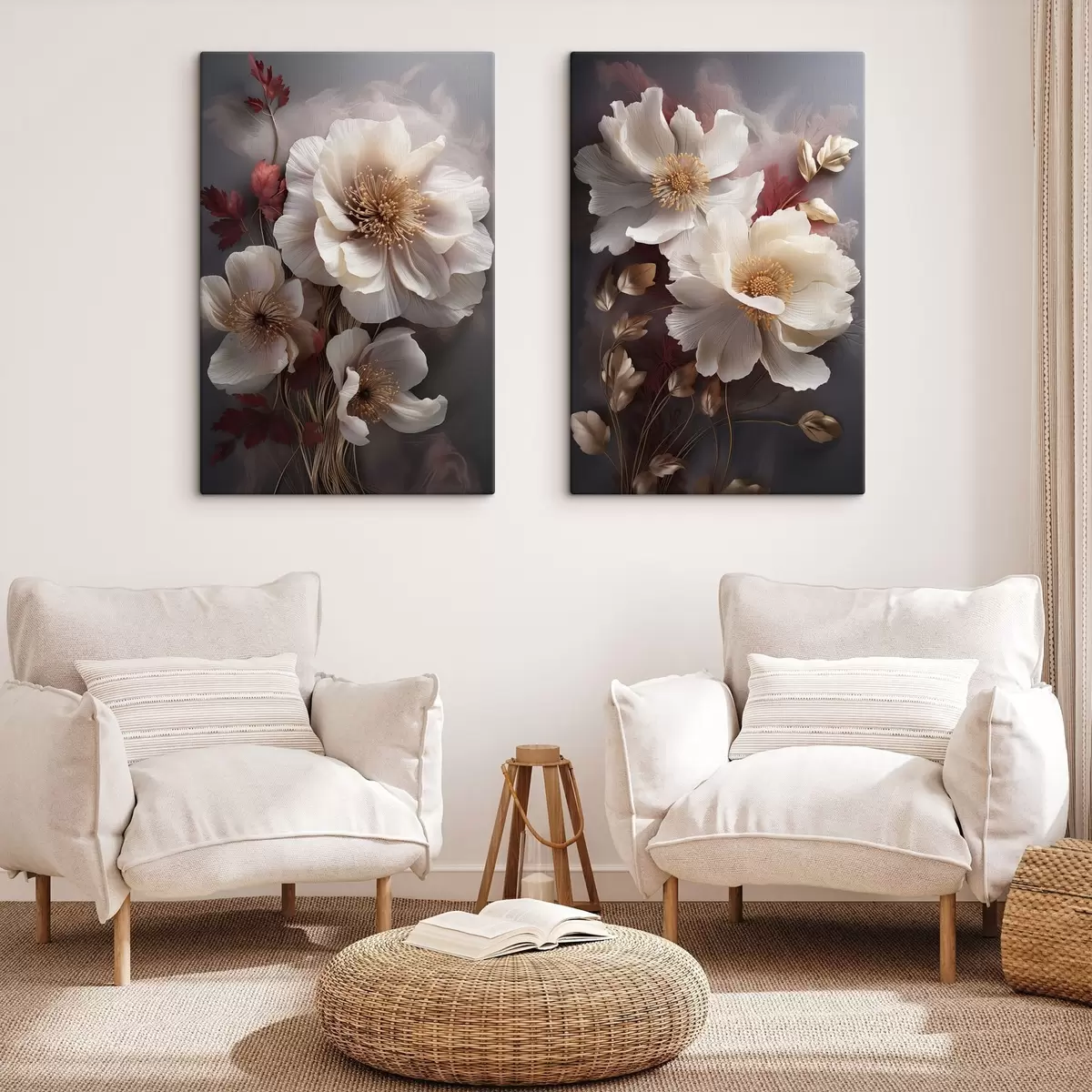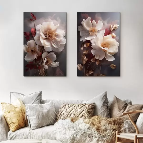 Gemälde Zarte Pfingstrosen mit dünnen, zarten Blütenblättern, umgeben von dunkelroten und gelben Blättern vor einem abstrakten Hintergrund Art. m01243