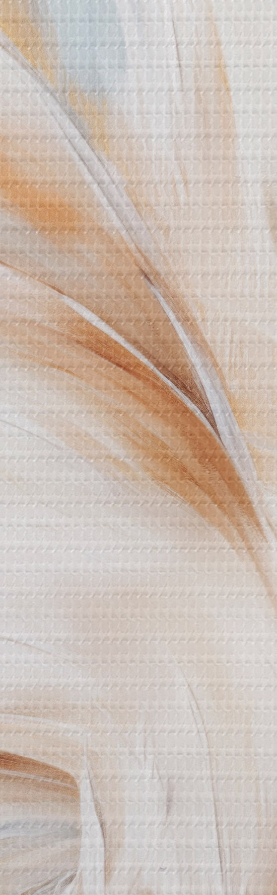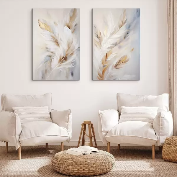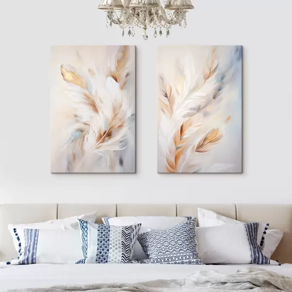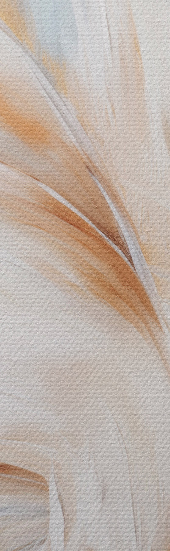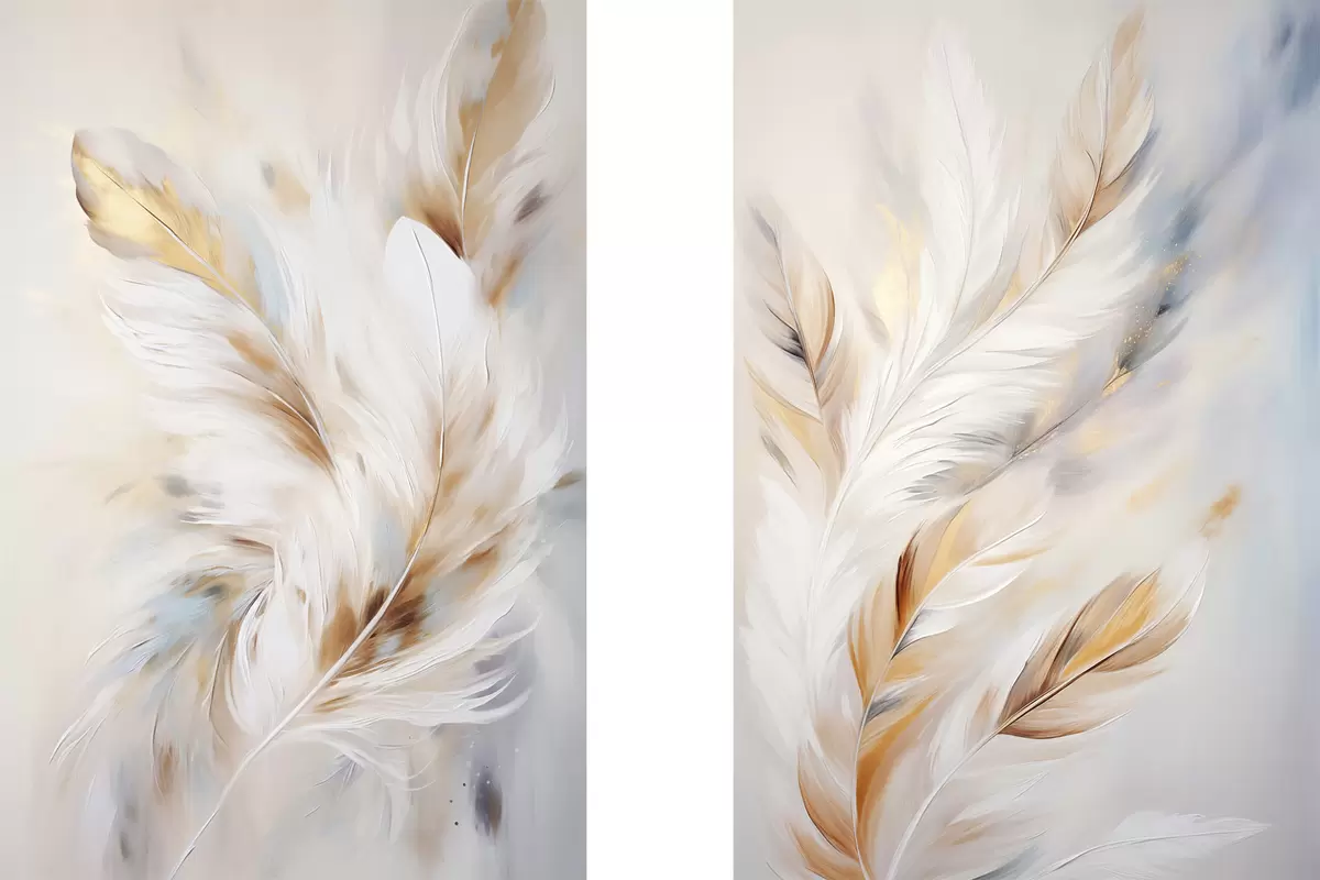Gemälde Große, weiche Federn in einer Mischung aus Weiß-, Gelb- und Brauntönen vor einem hellen, abstrakten Hintergrund Art. m01247