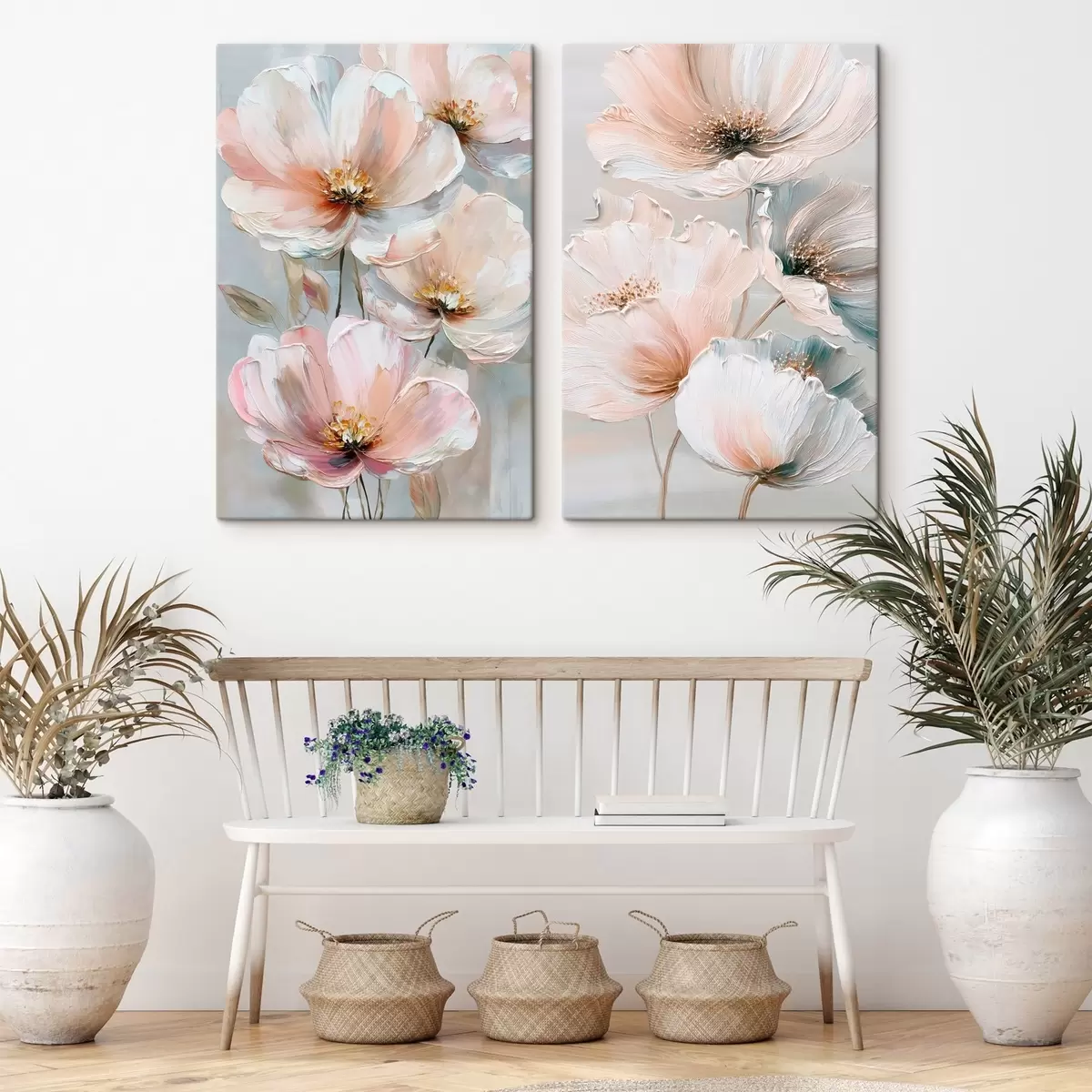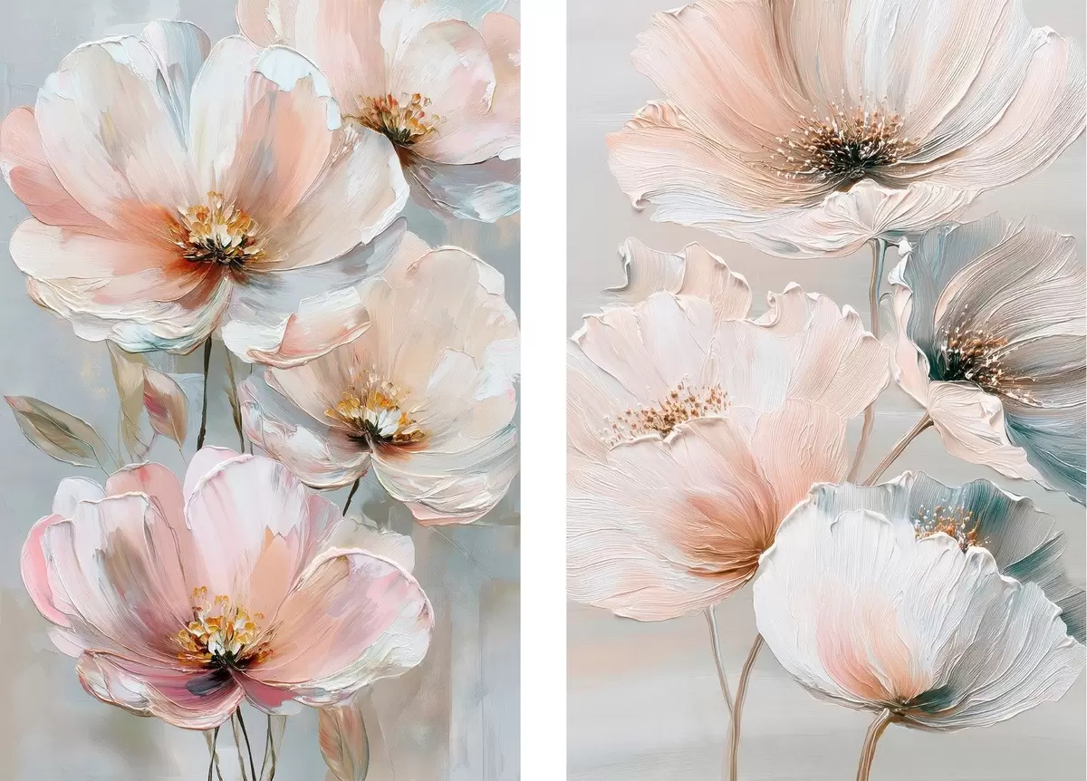 Gemälde Blumendiptychon in einer beige-korallenfarbenen Farbpalette im Stil eines Ölgemäldes Art. m30029
