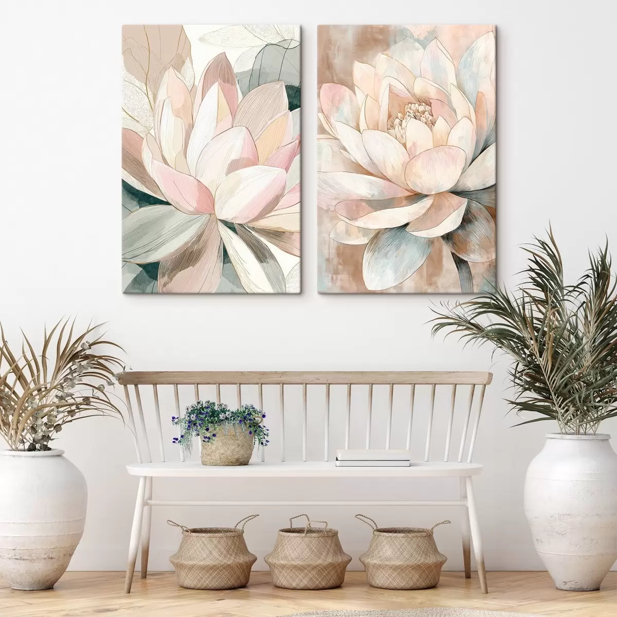Gemälde Blumenarrangement mit großen Lotusblumen in Pastell-Korallenfarben Art. m30034