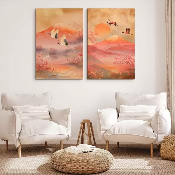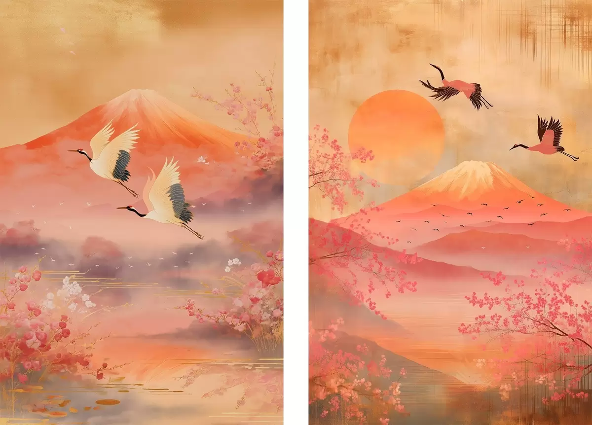 Gemälde Japanische Landschaft mit Kranichen und dem Berg Fuji in klassischem Illustrationsstil Art. m30042