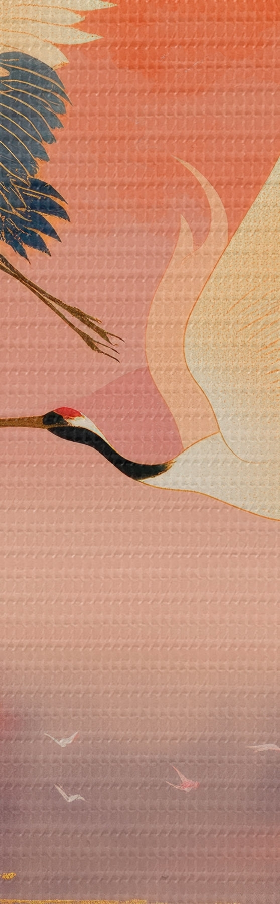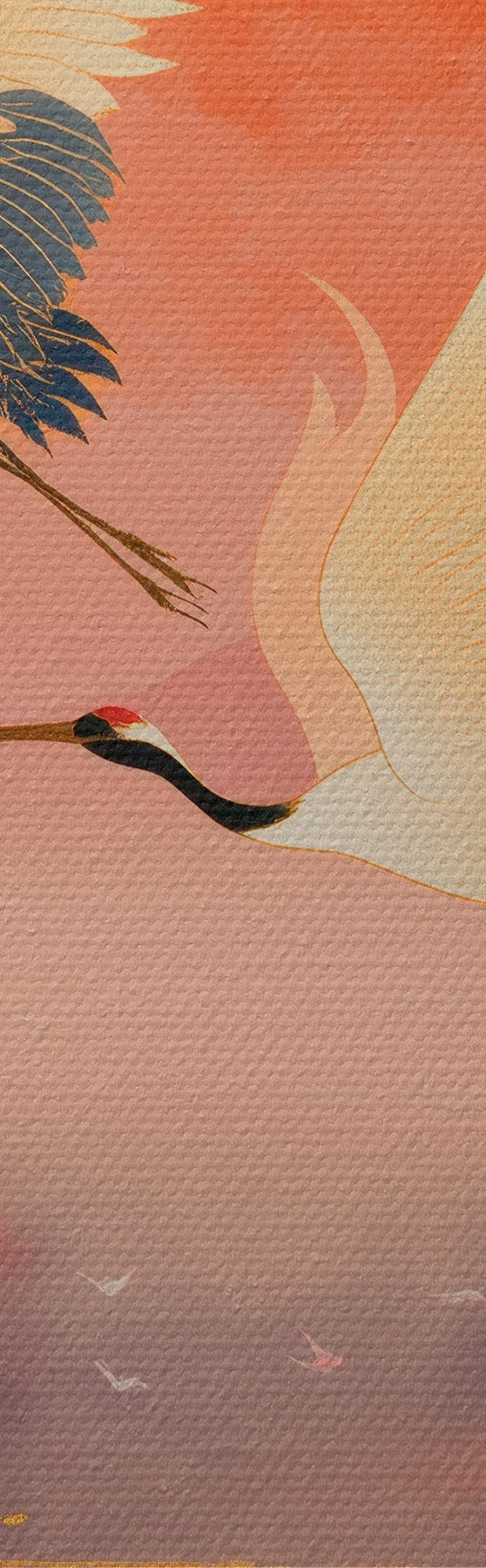 Fototapete Japanische Landschaft mit Kranichen und dem Berg Fuji in klassischem Illustrationsstil m30042