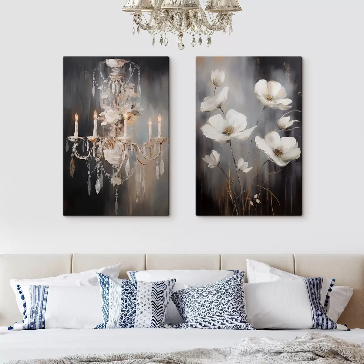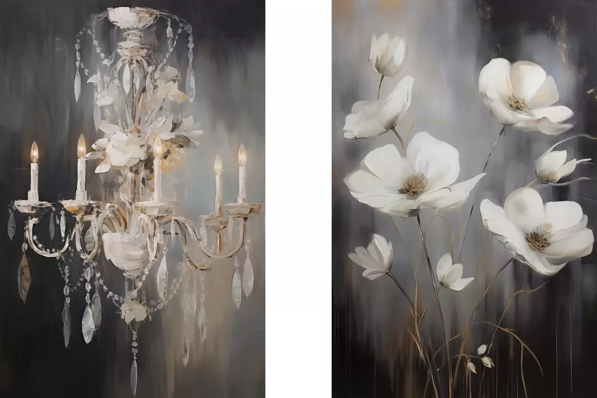 Gemälde Abstrakter, verzierter Kronleuchter mit brennenden Kerzen und Blumenkunst vor einem dunklen, strukturierten Hintergrund Art. m30049