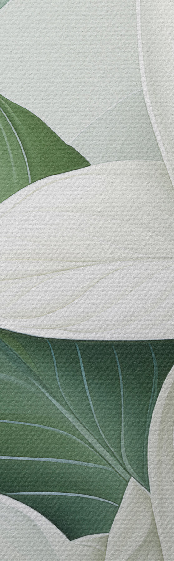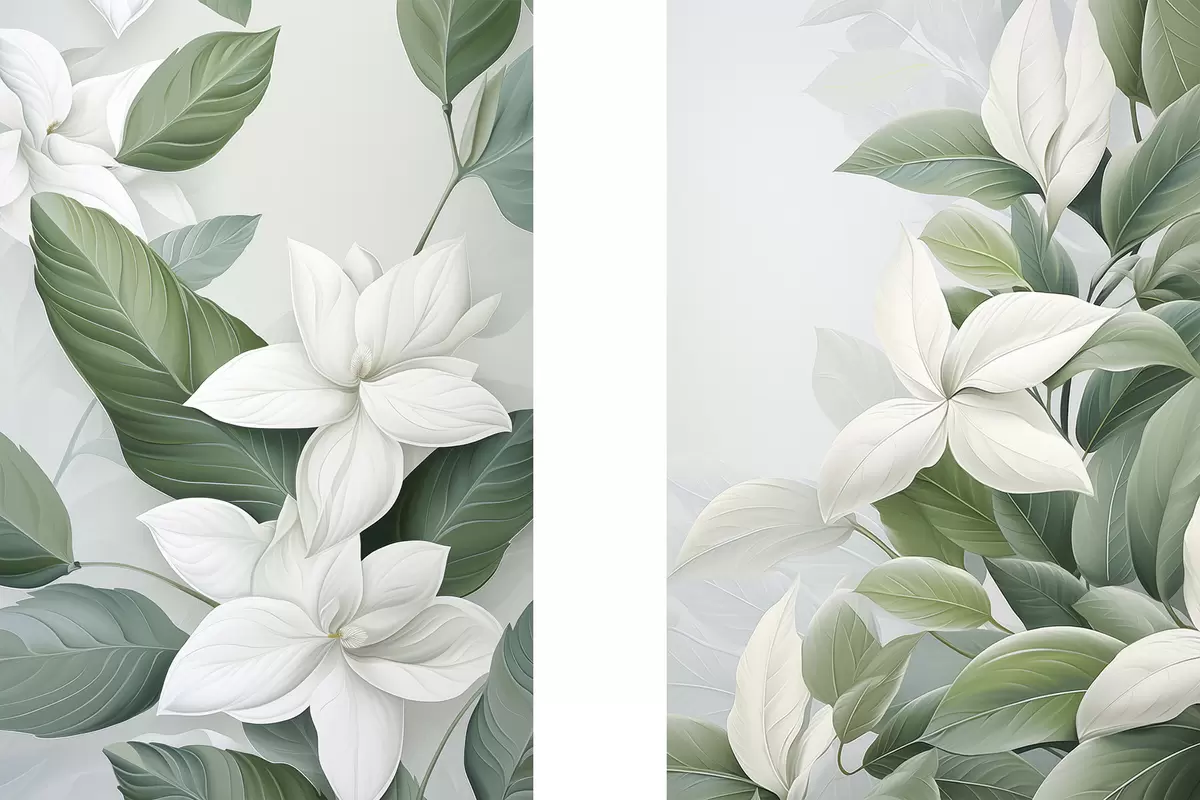 Gemälde Weiße Blumen mit grünen Blättern, pastellfarbener Hintergrund Art. m30055