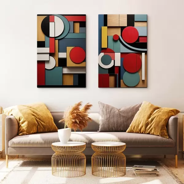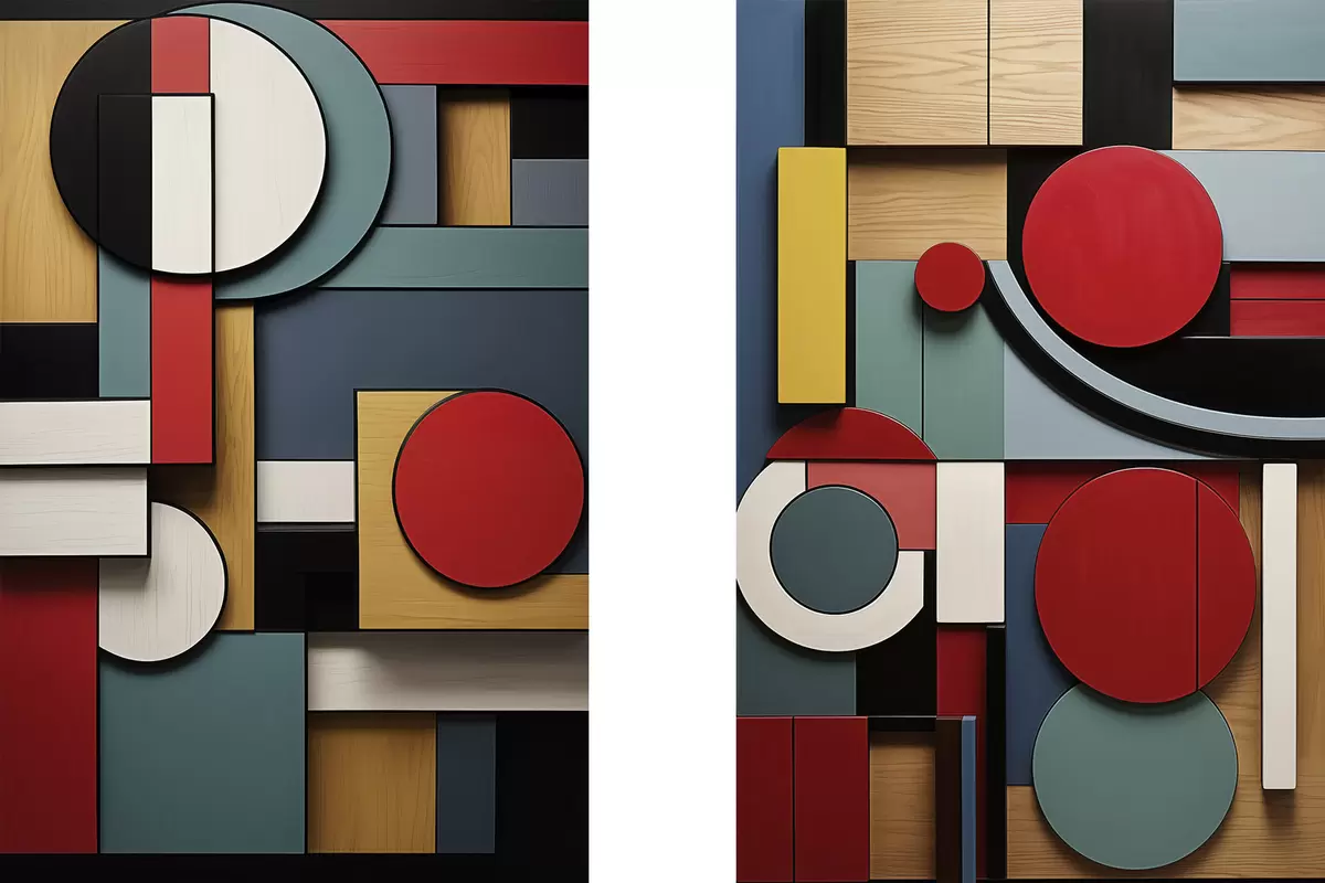 Gemälde Abstrakte geometrische Komposition mit Holzstrukturimitation, roten, schwarzen, weißen und blaugrünen Rechtecken und Kreisen Art. m30058