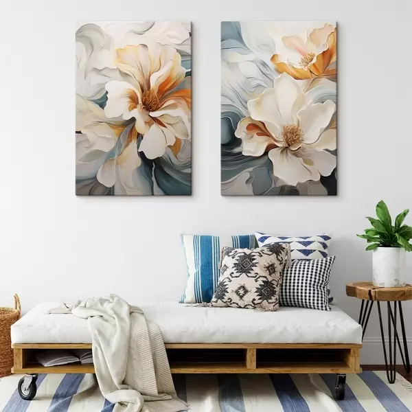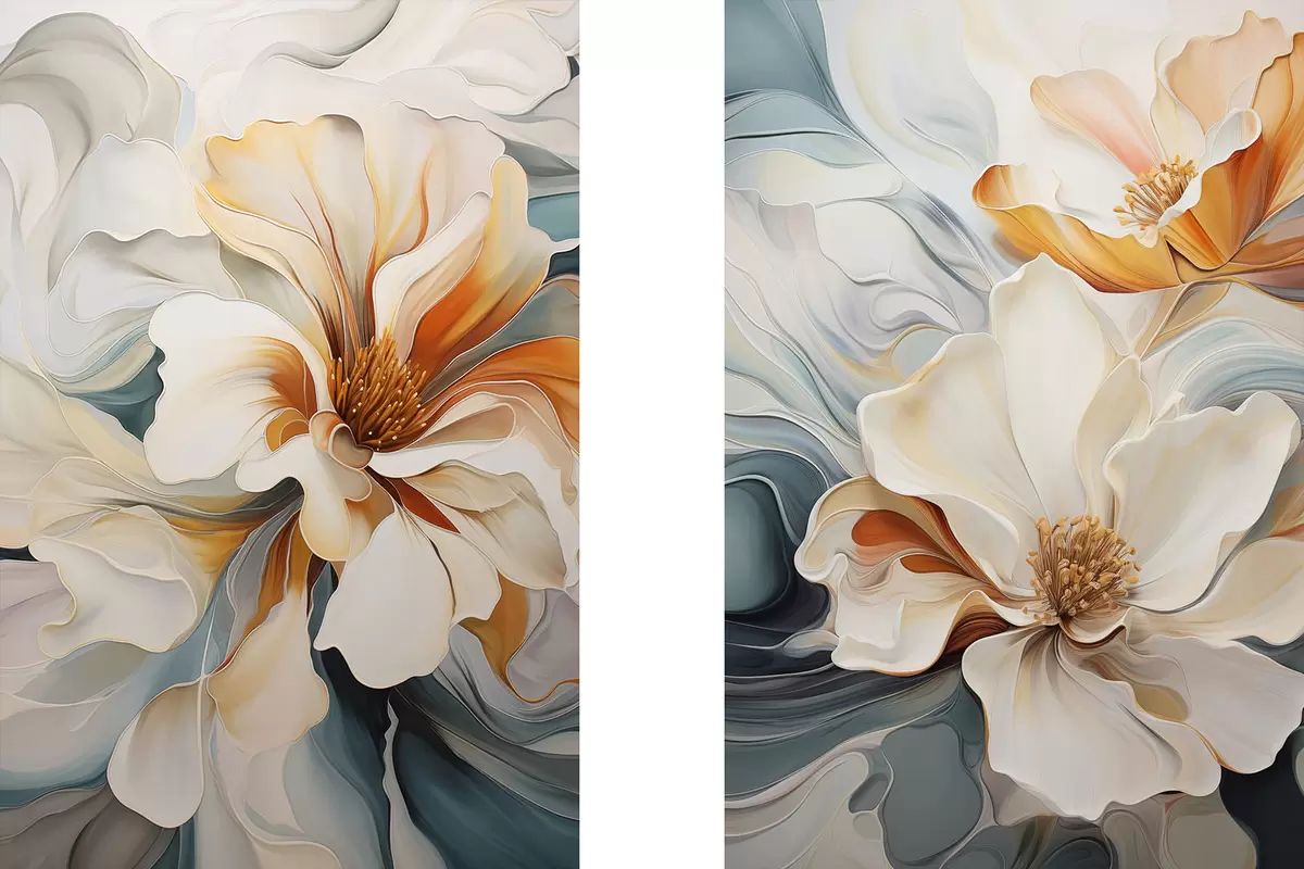 Gemälde Abstrakte große Blume mit weißen, orangefarbenen und blaugrünen Blütenblättern, strukturierter Hintergrund Art. m30059