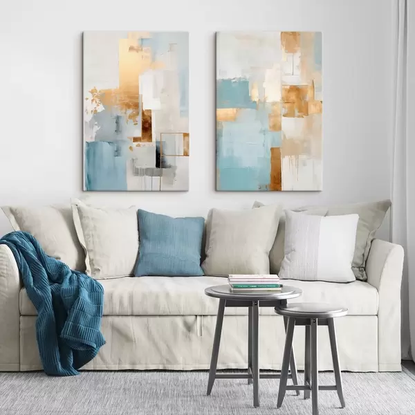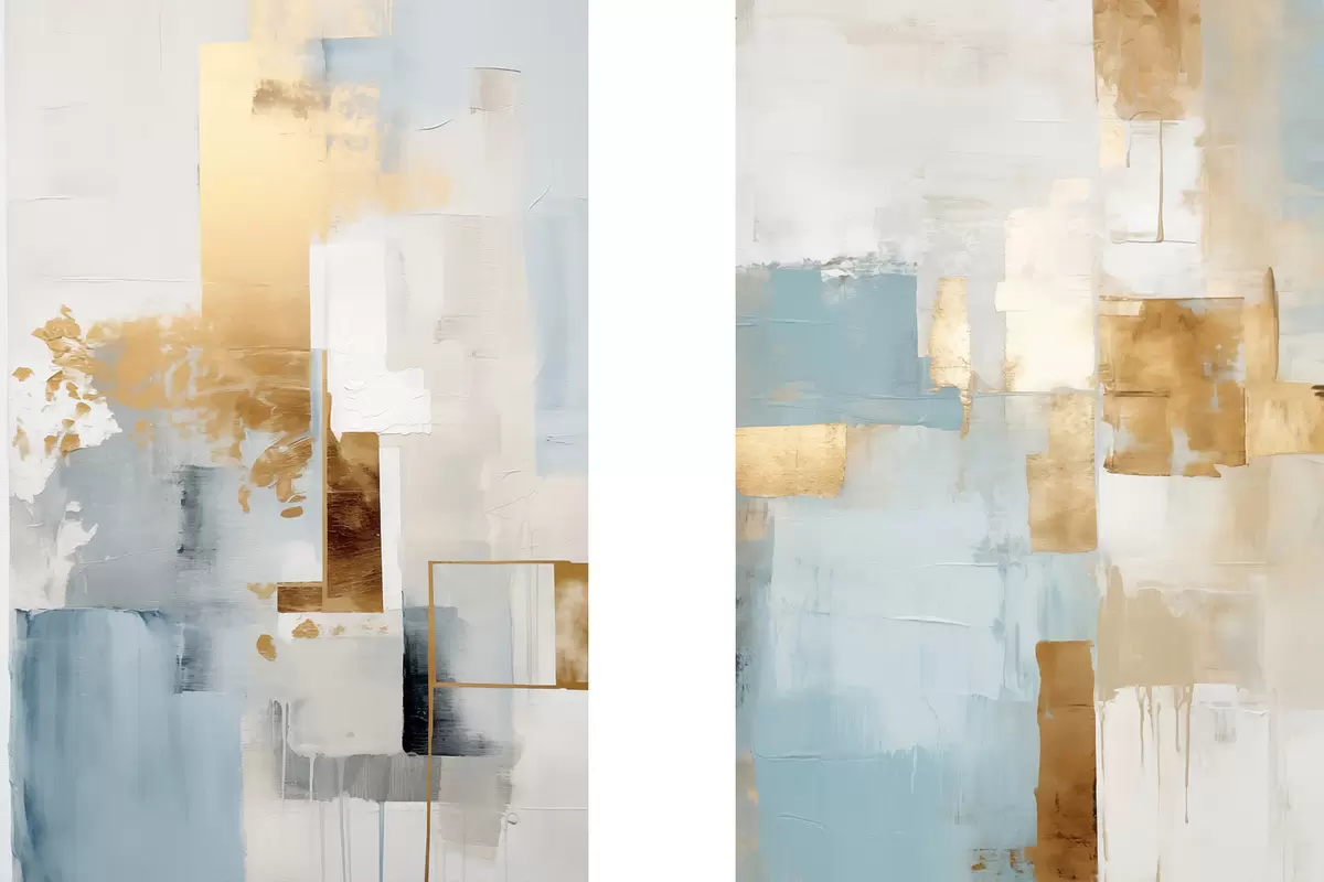 Gemälde Abstrakte geometrische Formen in Gelb, Blau und Weiß, strukturierte und minimalistische Komposition Art. m30061
