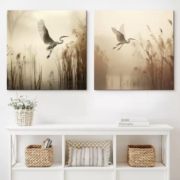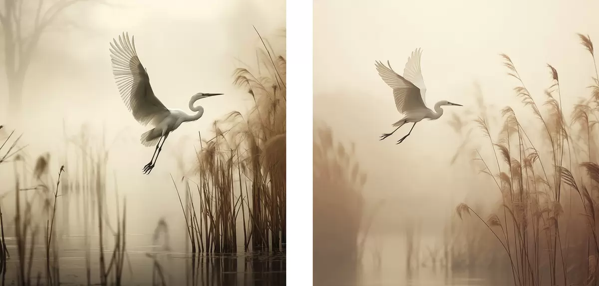 Gemälde Ein Silberreiher fliegt über einen See, umgeben von hohem Schilf und Bäumen im Hintergrund Art. m30199