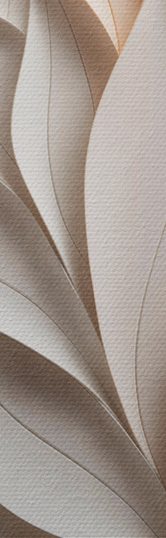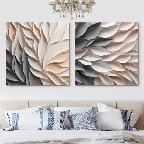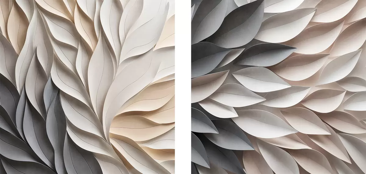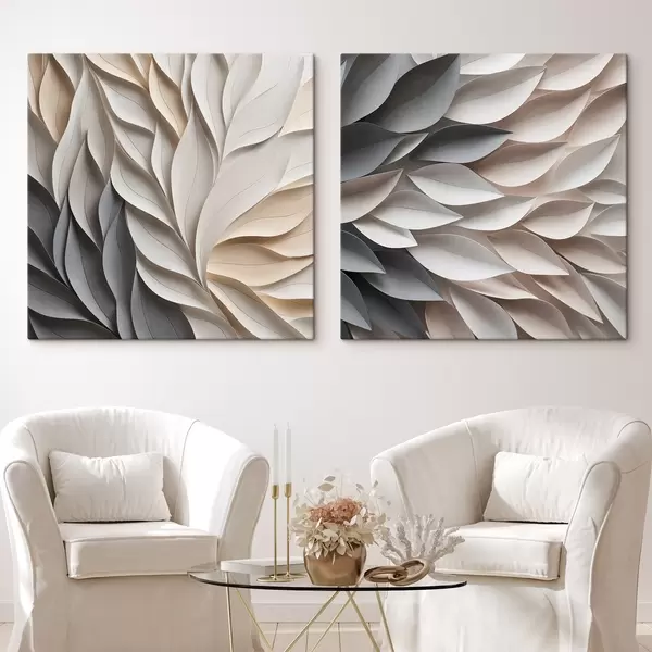 Gemälde Ein strukturiertes, sich überlappendes abstraktes Blattmuster in neutralen Beige-, Creme- und Grautönen Art. m30208