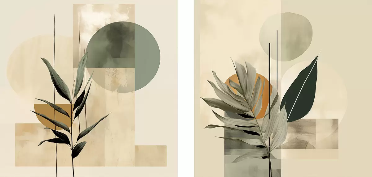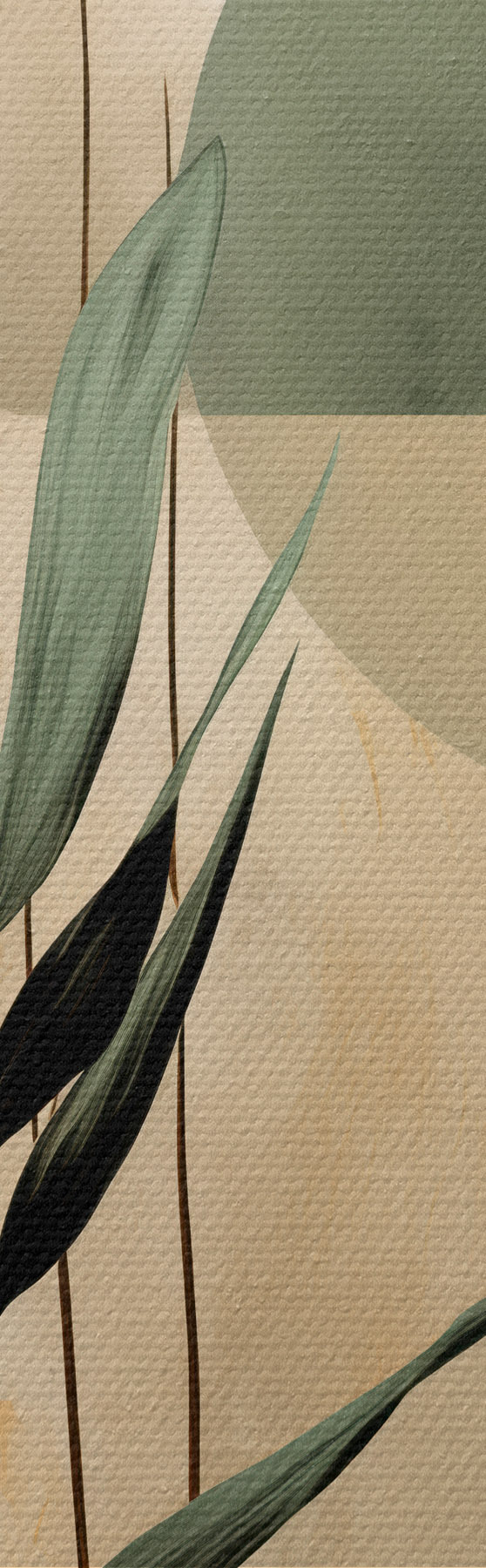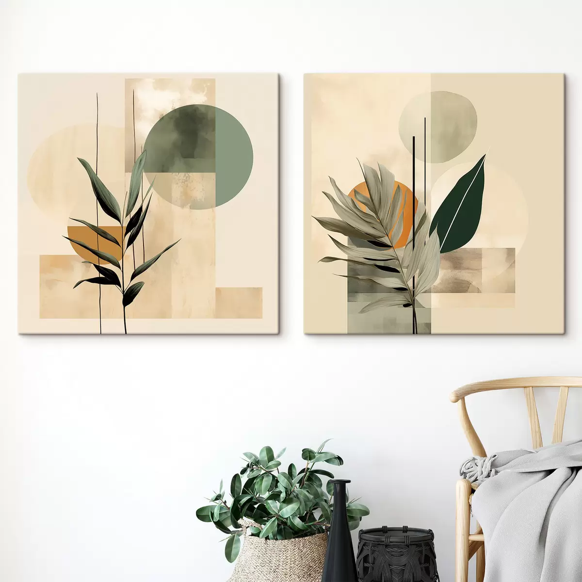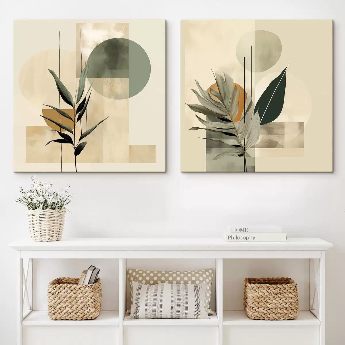 Gemälde Eine dunkelgrüne Pflanze mit abstrakten geometrischen Formen und Aquarellstrukturen in Beige und Grün Art. m30209