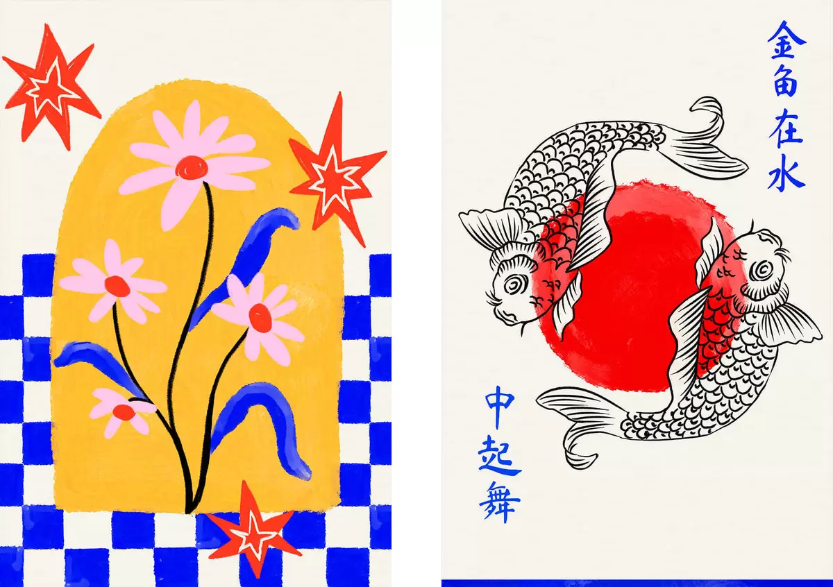 Gemälde Zweiteiliges Bild mit einer Katze und zwei Fischen in Rot- und Weißtönen Art. m30235