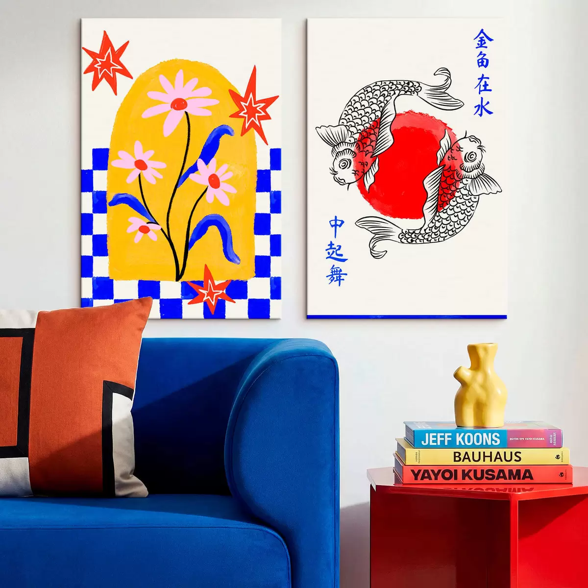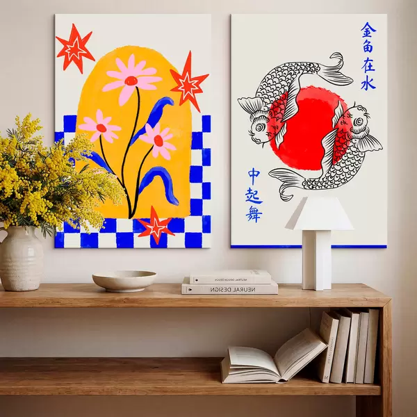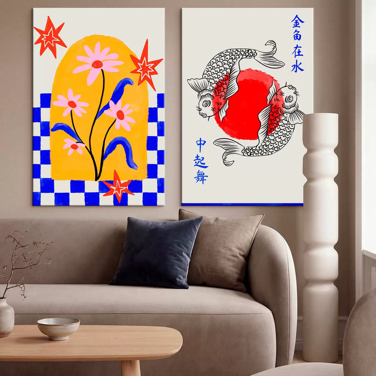 Fototapete Zweiteiliges Bild mit einer Katze und zwei Fischen in Rot- und Weißtönen m30235
