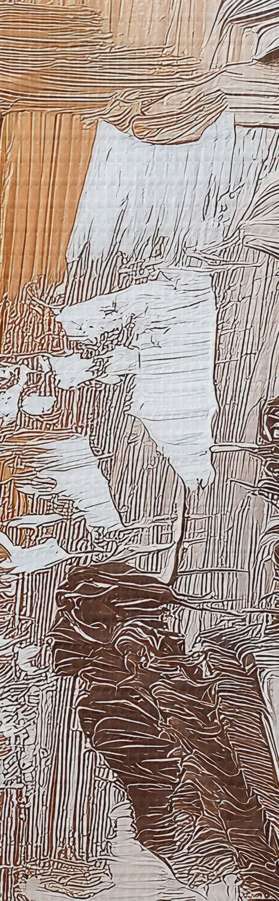 Das Bild kann vorsichtig mit einem trockenen, weichen Tuch oder Schwamm abgewischt werden; es wird nicht empfohlen, feuchte Produkte zu verwenden. Die Verwendung eines feuchten Schwamms ist nur zulässig, wenn das Bild lackiert wurde.