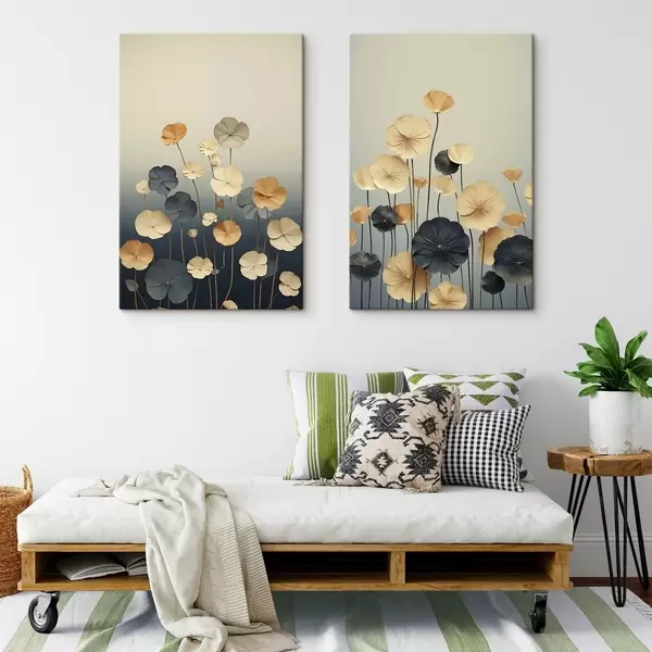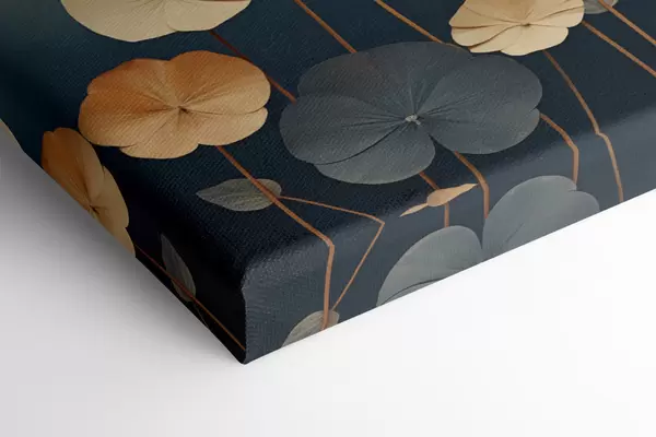 Gemälde Seerosenblätter vor einem gedämpften Hintergrund aus Beige und Dunkelblau Art. m30317
