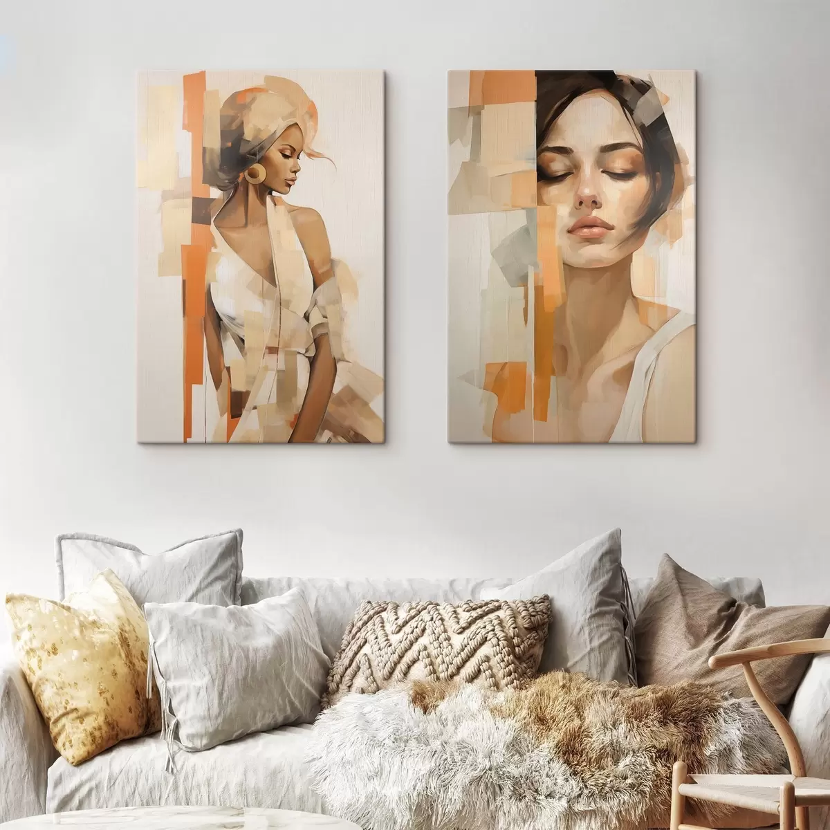 Fototapete Abstraktes Frauenporträt mit orangefarbenen und beigen Formen m30318