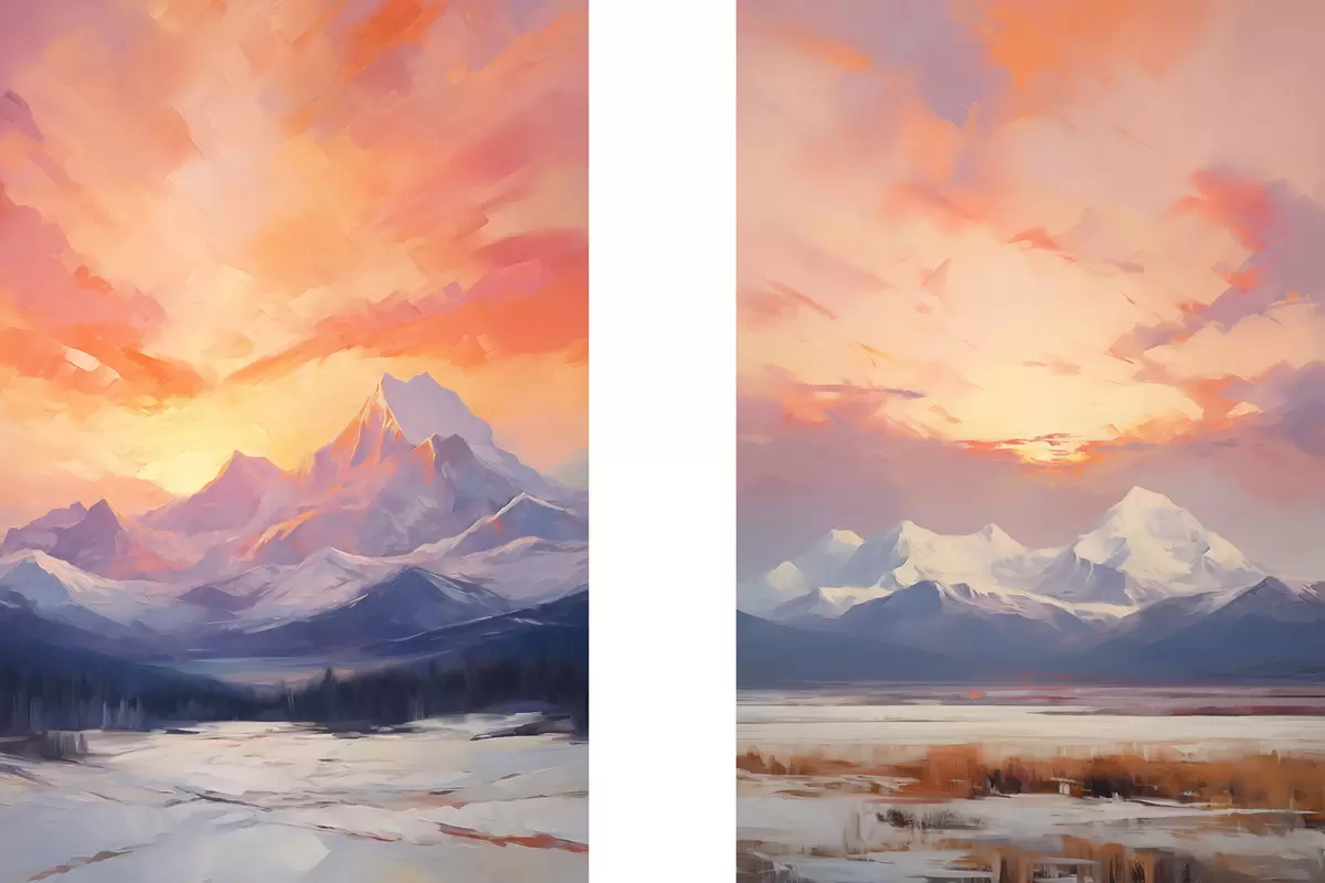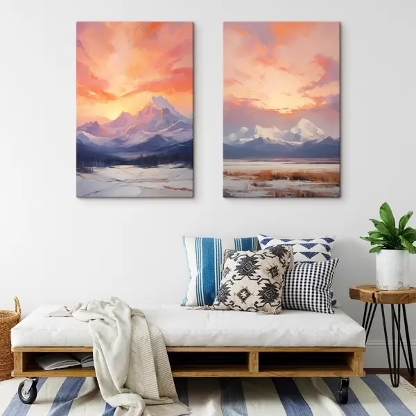 Gemälde Schneebedeckte Berge unter einem leuchtend orange-rosa Himmel mit Wolken Art. m30321