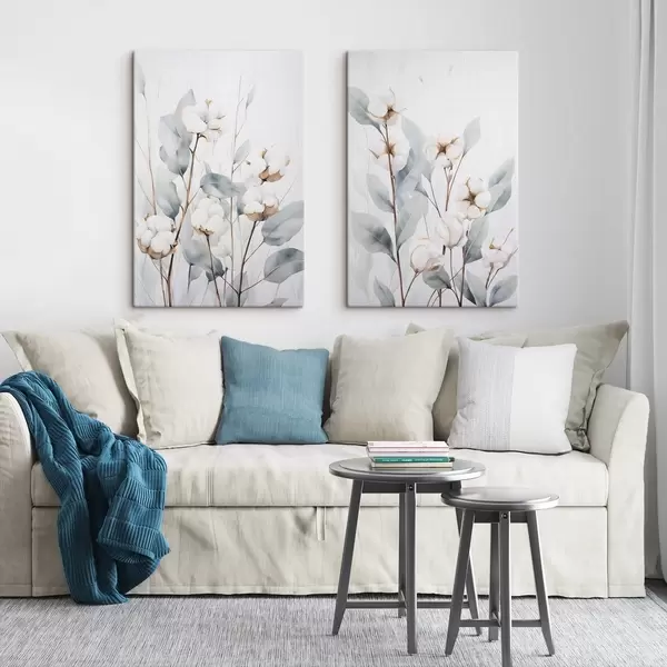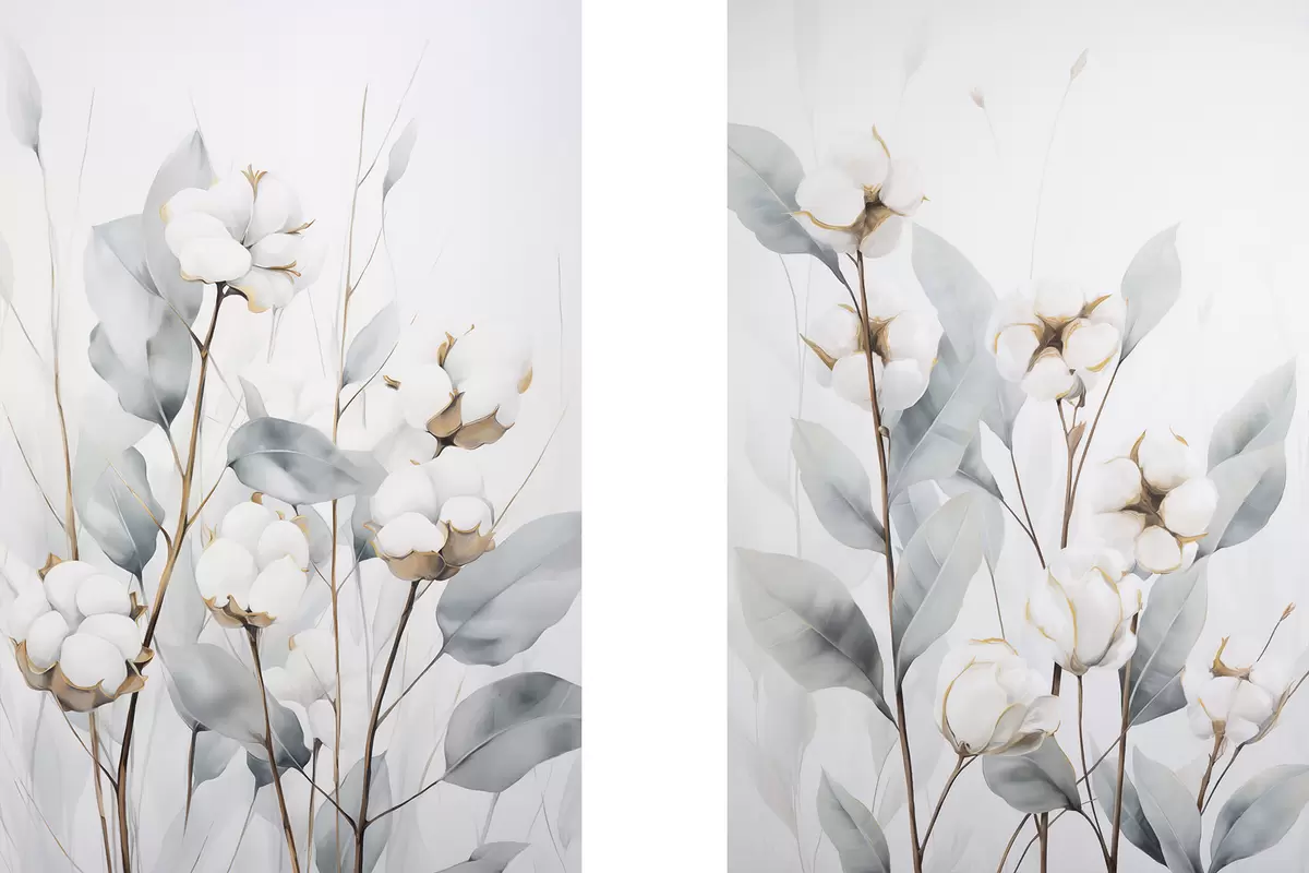 Gemälde Eine weiße Baumwollpflanze mit hellblaugrünen Blättern vor einem hellen Hintergrund Art. m30322