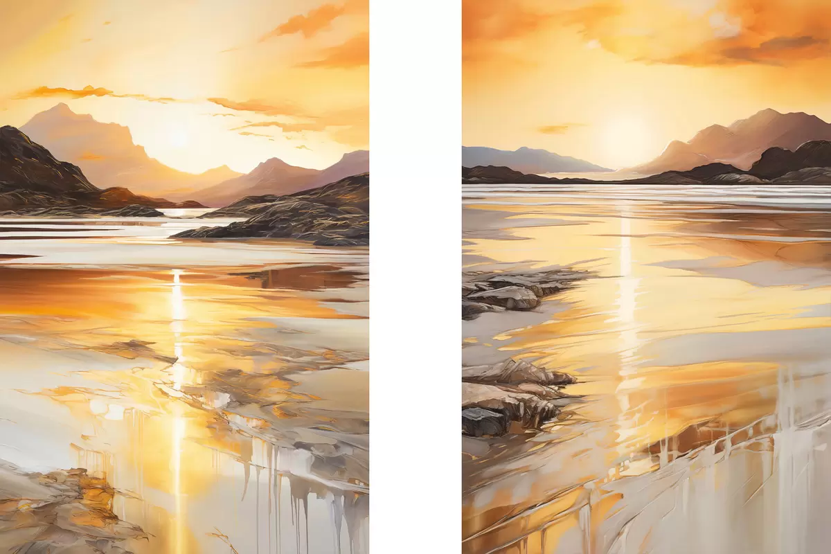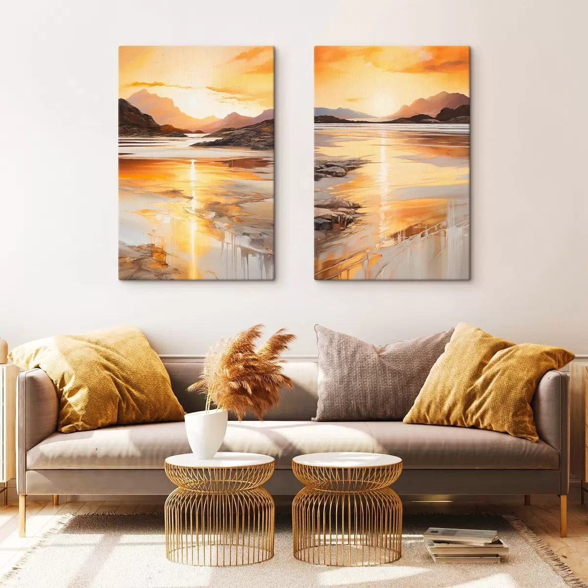 Gemälde Eine Landschaft mit einem Fluss und Bergen unter einem warmen orangefarbenen Himmel, Sonnenuntergang Art. m30328