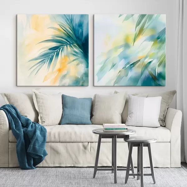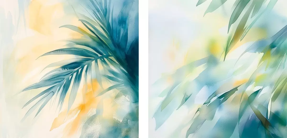 Gemälde Tropische Blätter in einer türkis-gelben Farbpalette im Aquarellstil Art. m30351