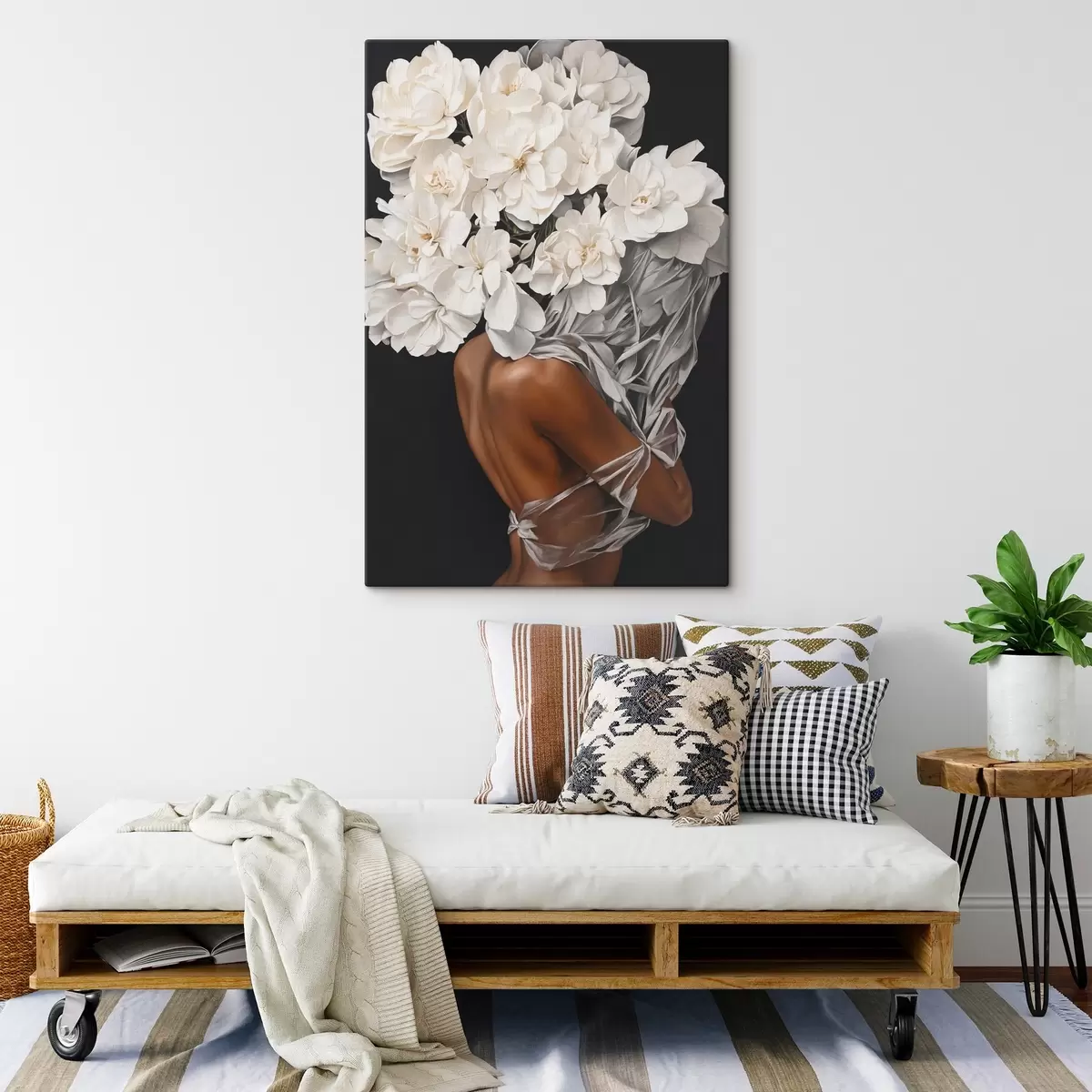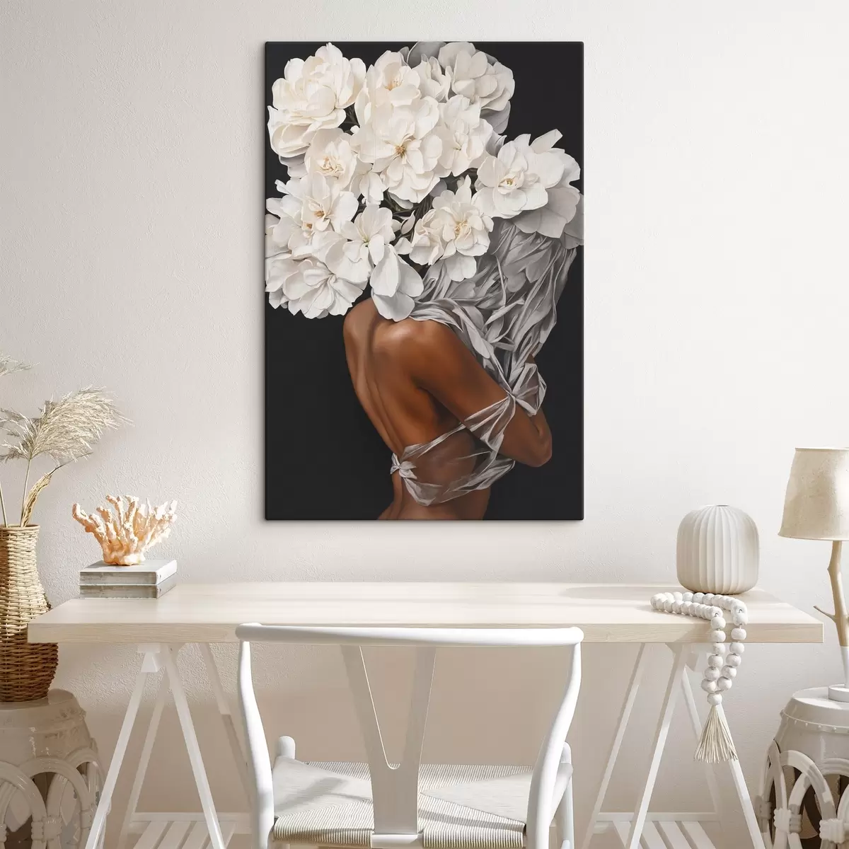 Gemälde Frau mit weißen Blumen auf schwarzem Hintergrund Art. s37163