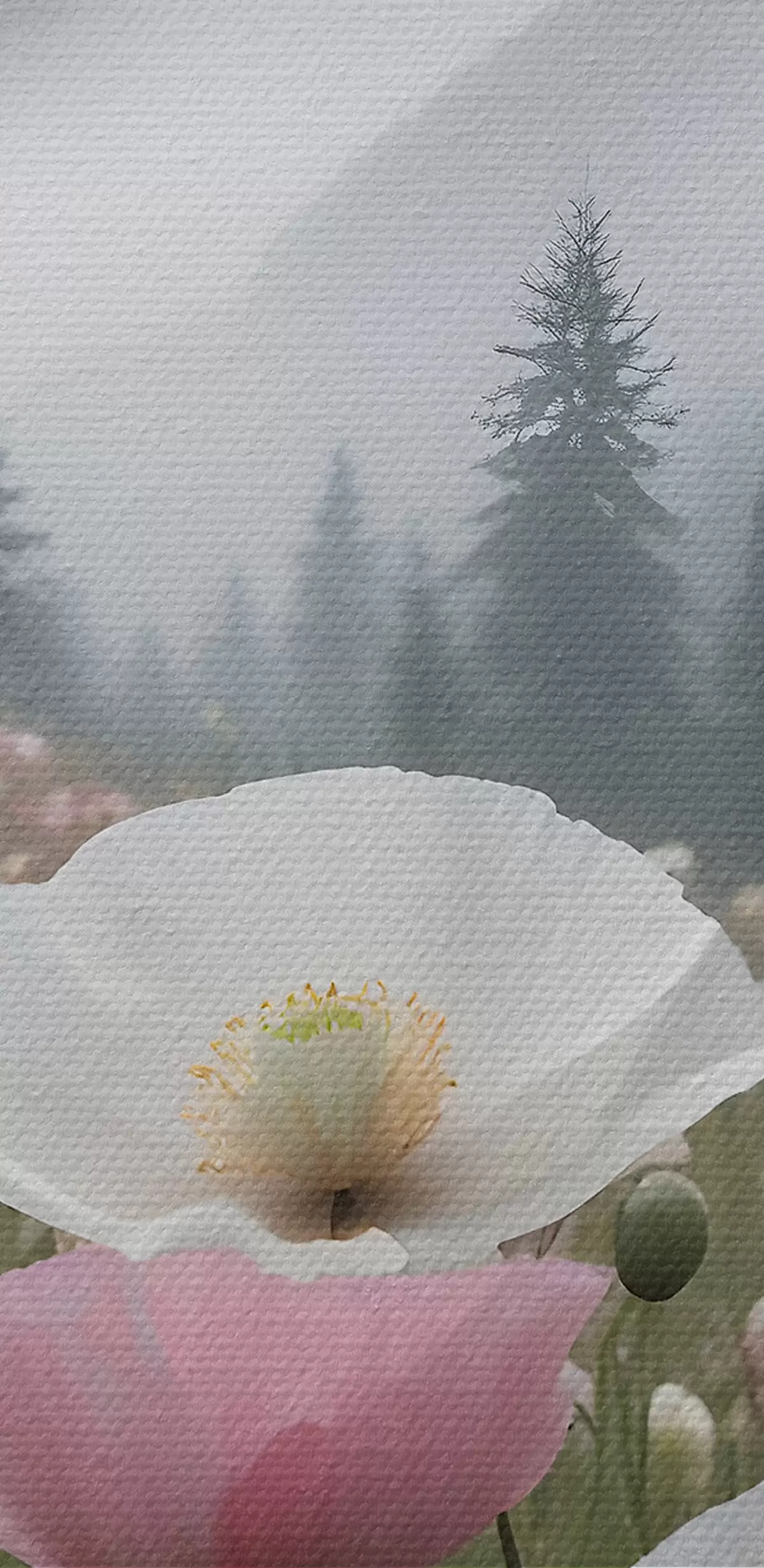 Fototapete Ein Feld mit rosa und weißen Mohnblumen in der Berglandschaft im Hintergrund s38369