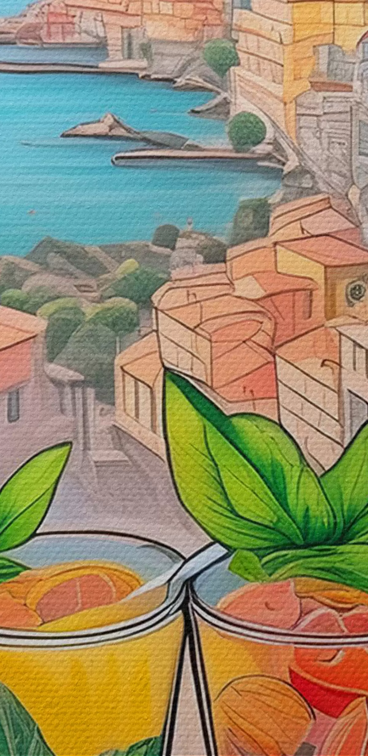 Gemälde Italienische Stadt, Meeresküste, Cocktails, Berufung, Architektur, Sommer, Aquarell Art. s38392