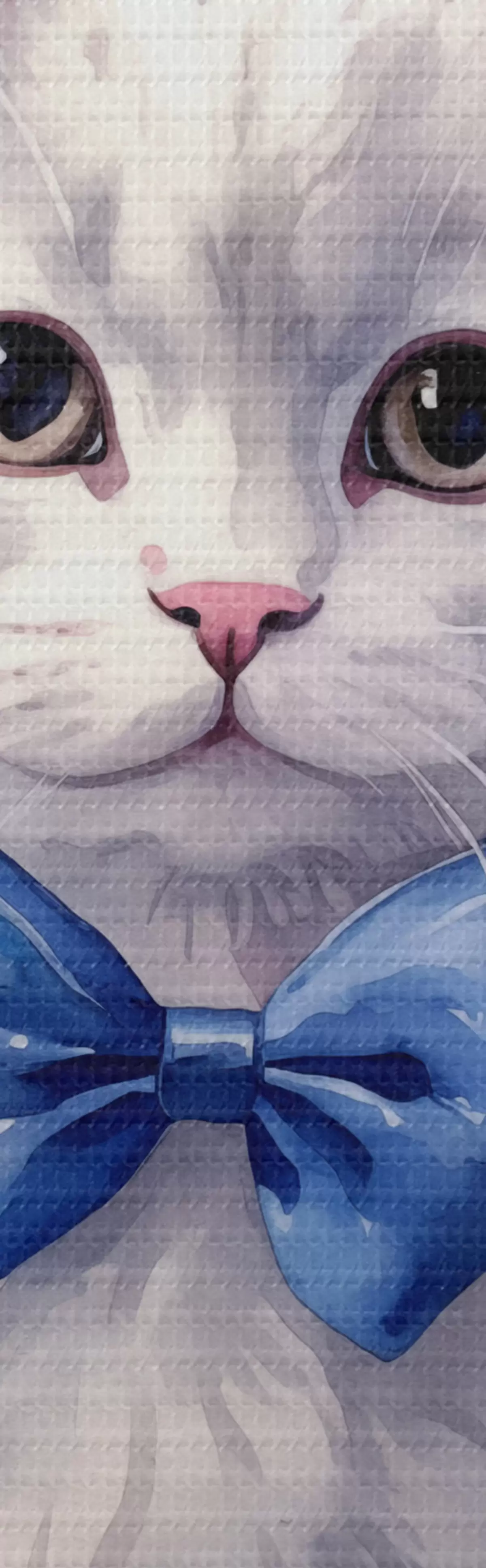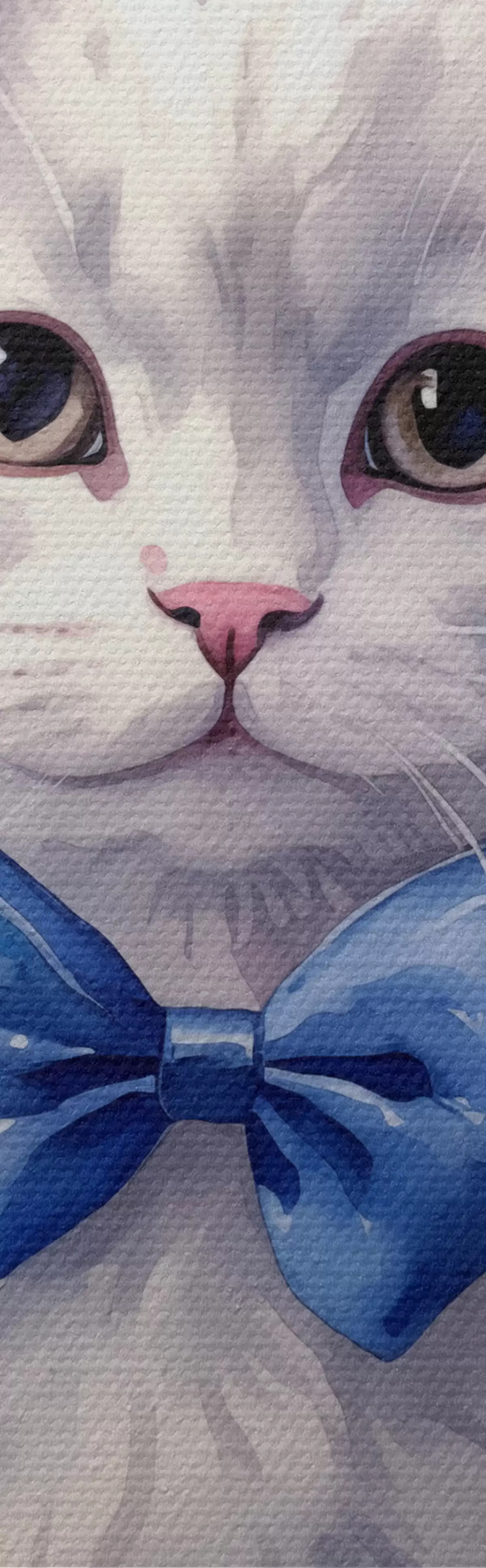 Gemälde Weiße flauschige Katze mit einer blauen Schleife am Hals, Aquarell, Tier, grau, weiß, rosa, blaue Farbe Art. s38479