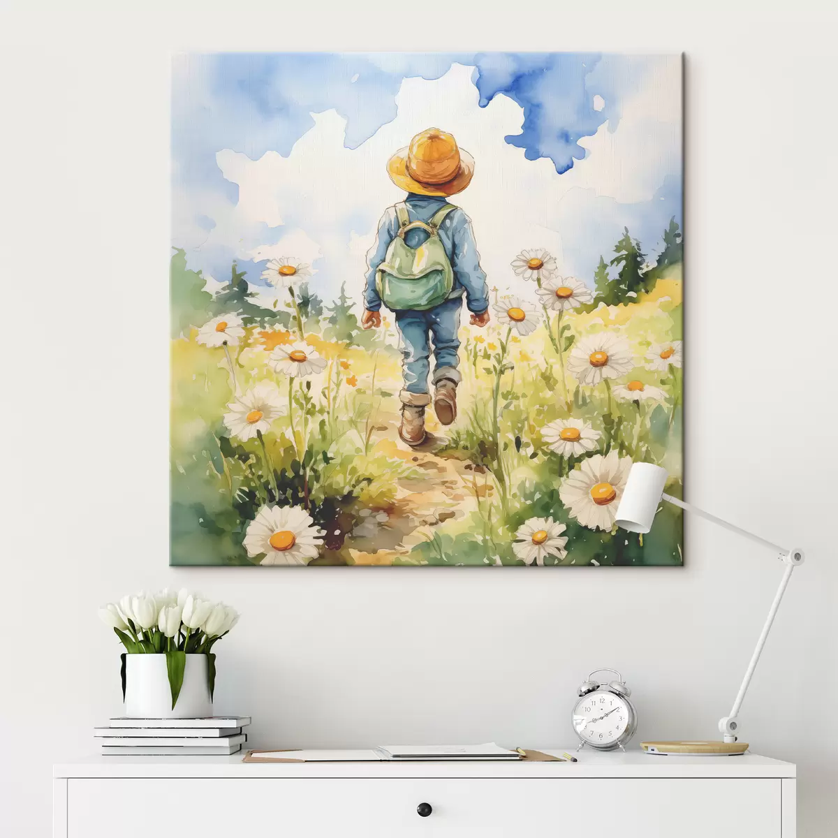 Gemälde Ein Junge mit Cowboyhut, grünem Rucksack auf dem Rücken und blauem Anzug geht einen Weg durch ein Kamillenfeld entlang, Aquarell Art. s38946
