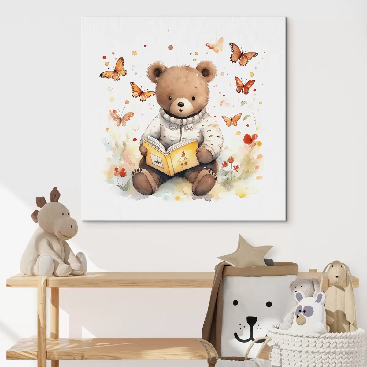 Gemälde Braunbärjunges im Pullover liest ein Buch, umgeben von Aquarell-Schmetterlingen Art. s39025