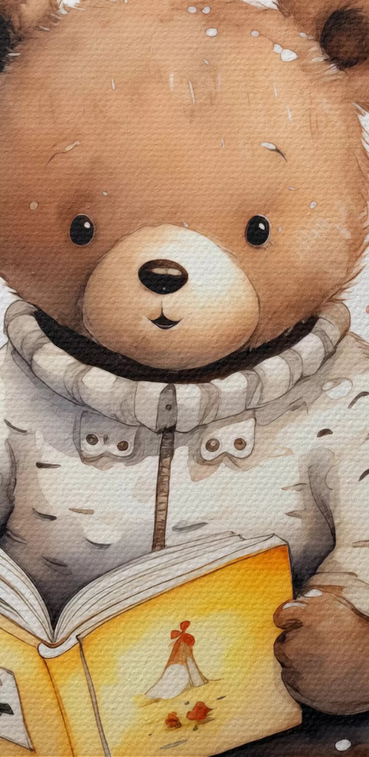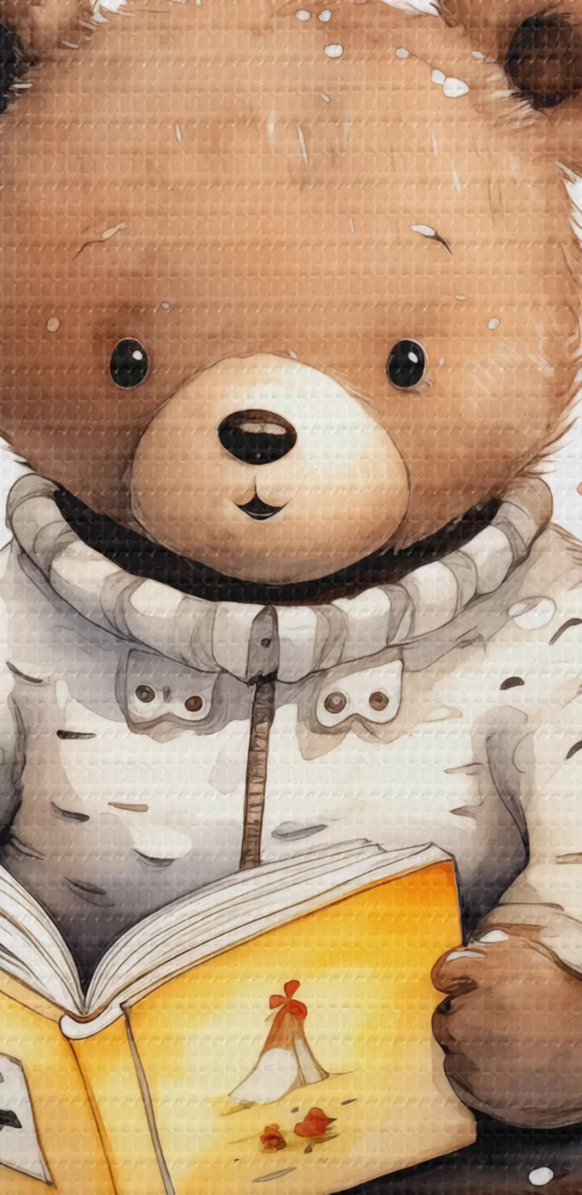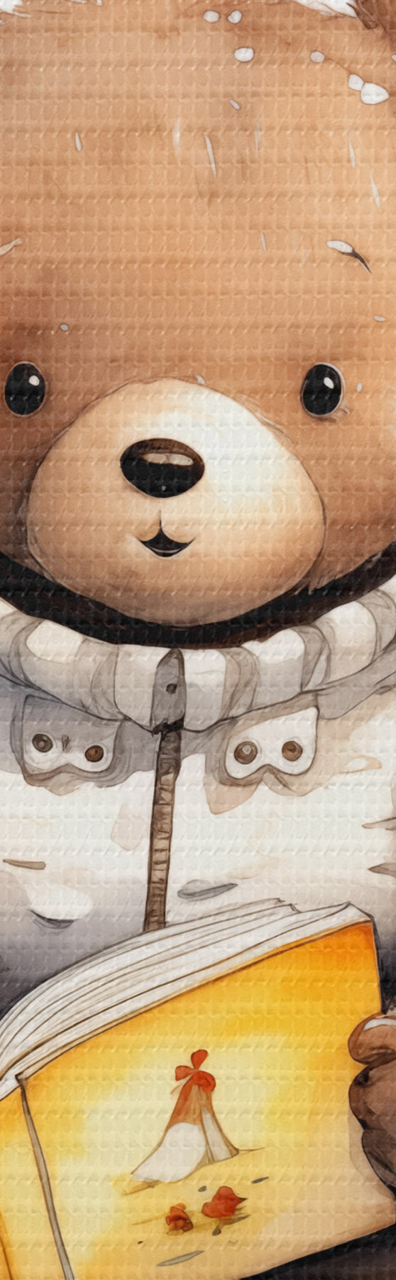 Fototapete Braunbärjunges im Pullover liest ein Buch, umgeben von Aquarell-Schmetterlingen s39025
