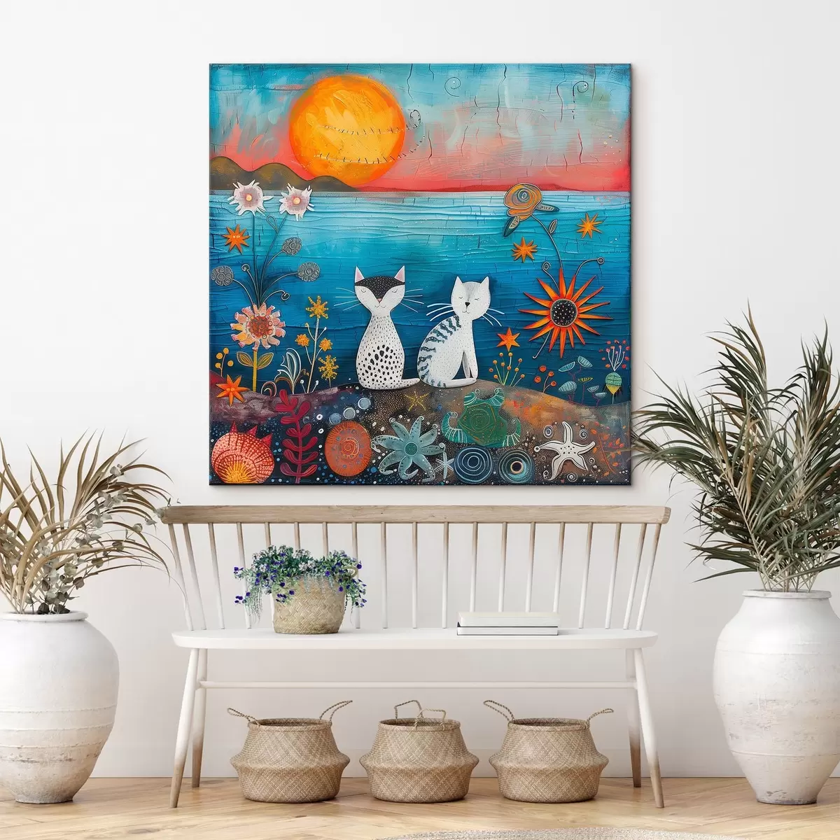 Gemälde Katzen beim Sonnenuntergang, bunte Blumen Art. s39085
