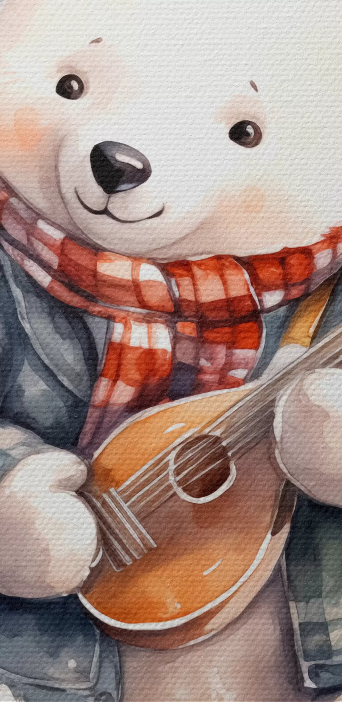 Gemälde Eisbär-Musiker in blau kariertem Anzug und rotem Schal spielt Gitarre, Aquarell-Illustration für Kinder Art. s39120