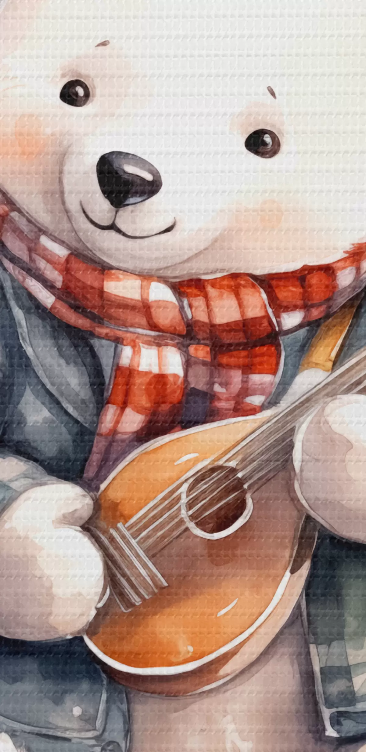 Fototapete Eisbär-Musiker in blau kariertem Anzug und rotem Schal spielt Gitarre, Aquarell-Illustration für Kinder s39120