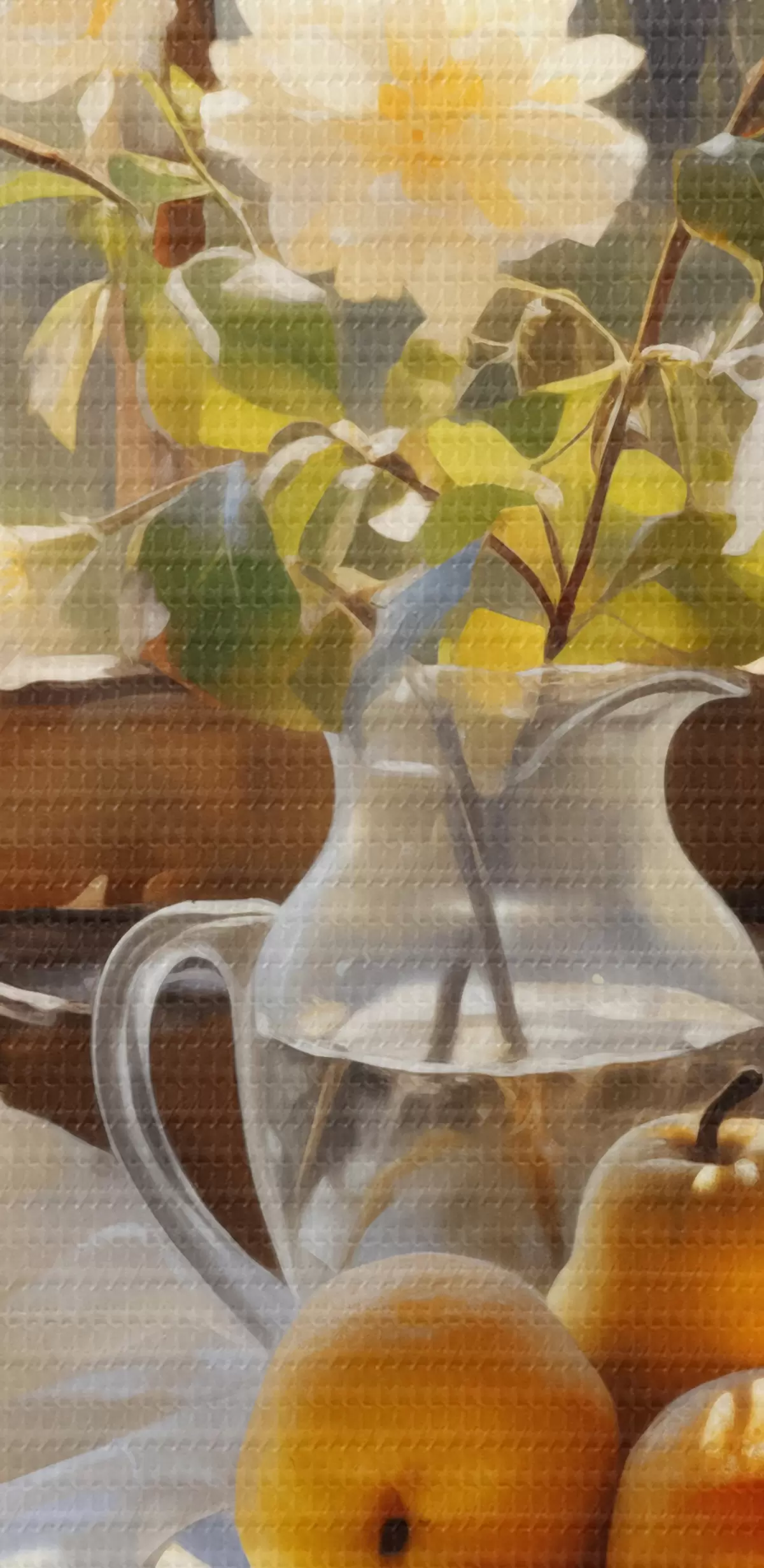 Gemälde Rustikales Stillleben mit gelben reifen Birnen auf einem Teller auf einem Tisch am Fenster, weiße Rosen in einem Glaskrug, weiße Spitzenvorhänge Art. s39129