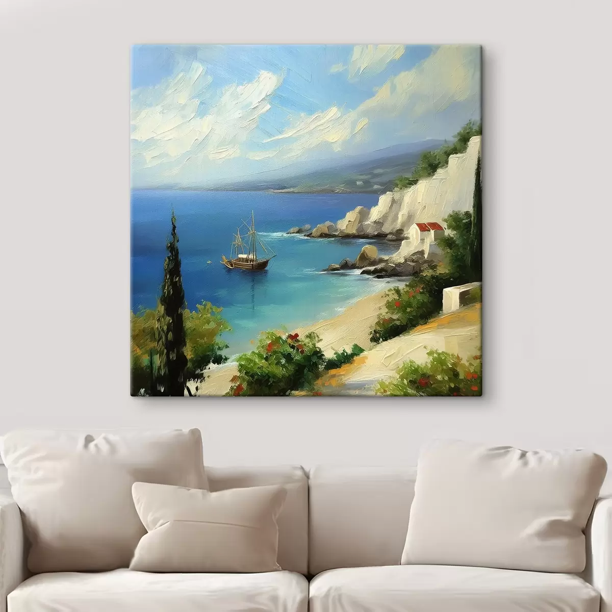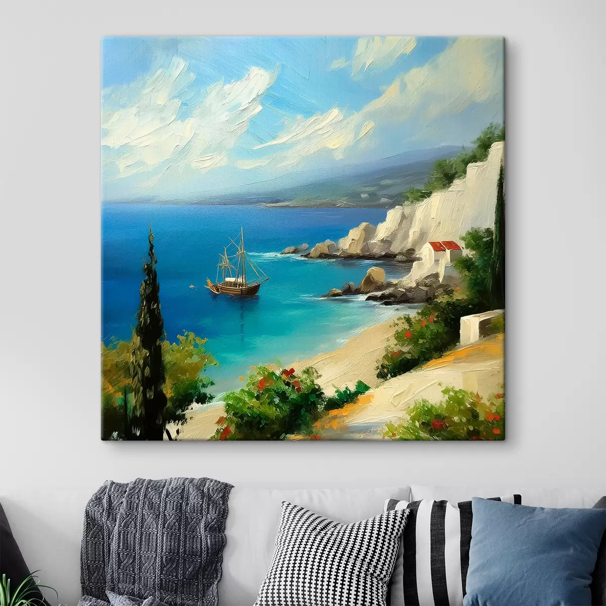 Fototapete Griechische Küste, Schiff, blaues Wasser, Ölgemälde, Sommernatur, Felsen, lebendige Pinselstriche s39425