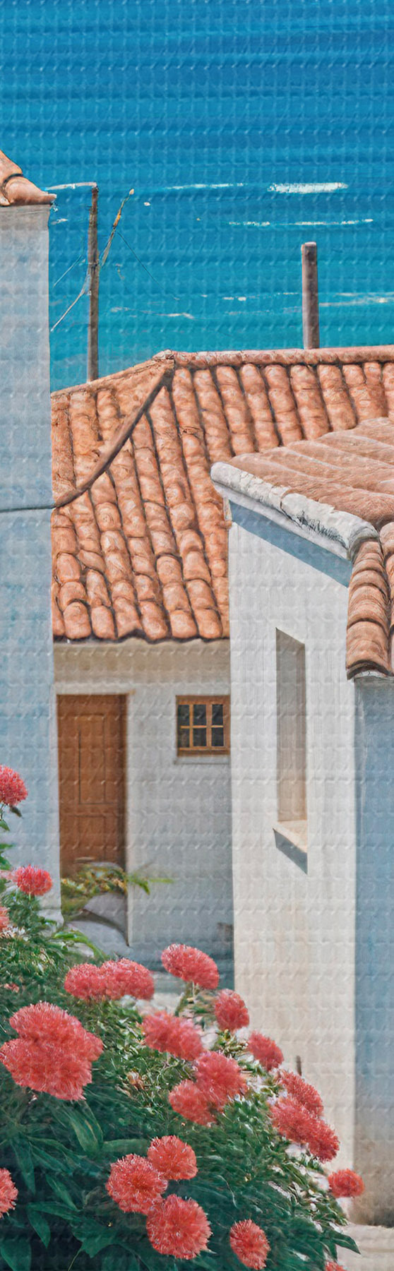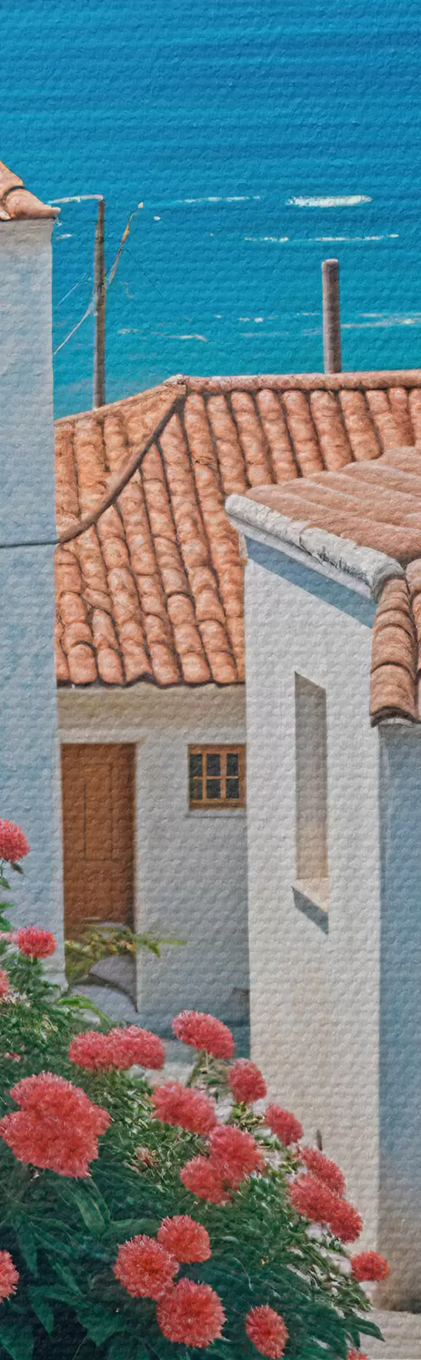 Gemälde Eine schmale Straße in einer Küstenstadt mit weißen Gebäuden, roten Ziegeldächern und leuchtend rosa Blumen Art. s39532