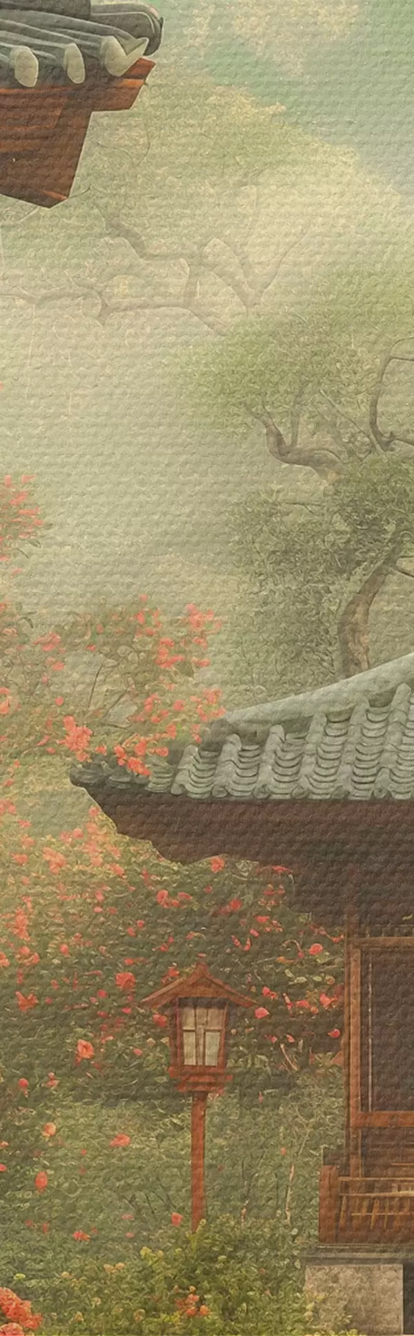 Gemälde Japanischer Park mit blühenden Bäumen und Blumen, Wald, Holzhaus Art. s39773