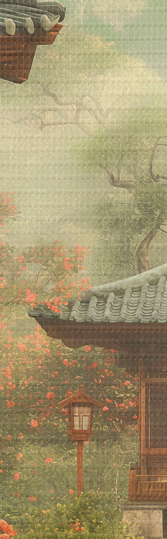 Fototapete Japanischer Park mit blühenden Bäumen und Blumen, Wald, Holzhaus s39773