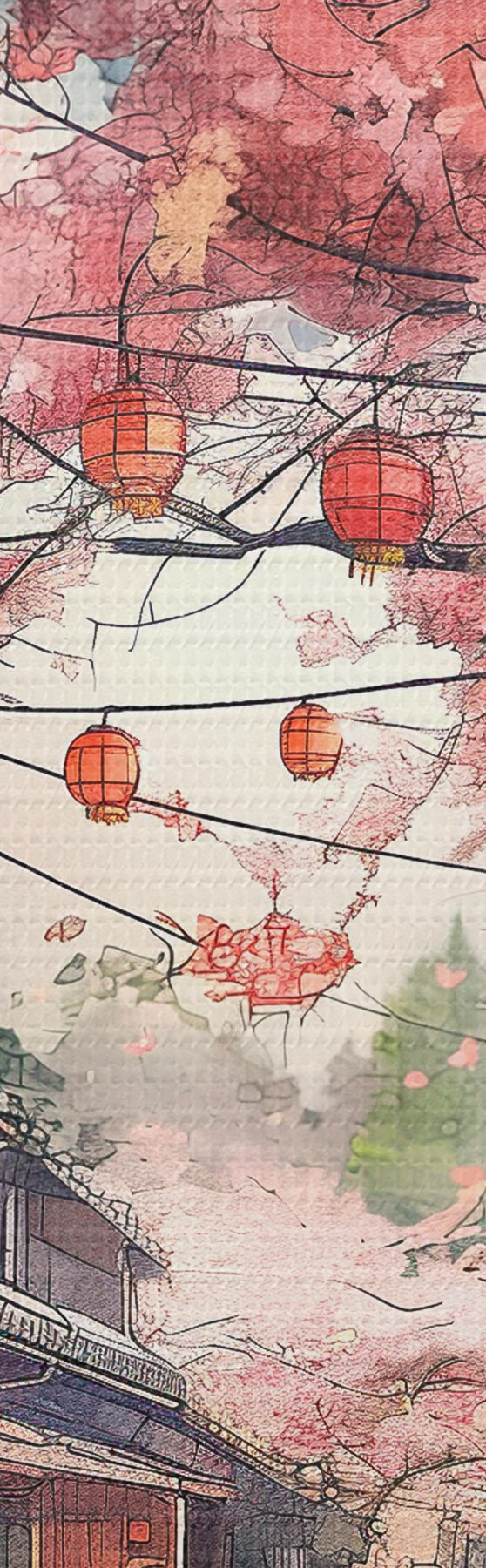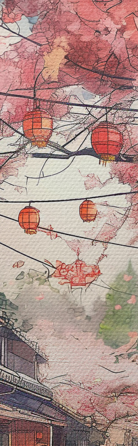 Gemälde Japanische Straße mit blühenden Kirschbäumen, orientalischer Architektur, Laternen Art. s39774