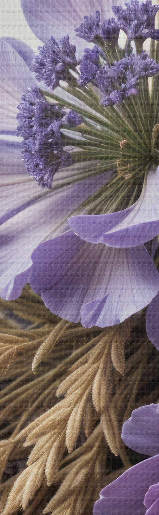 Fototapete Ein Strauß violetter Blumen, darunter Pfingstrosen und Lavendel, mit Weizenhalmen auf hellem Hintergrund s40030